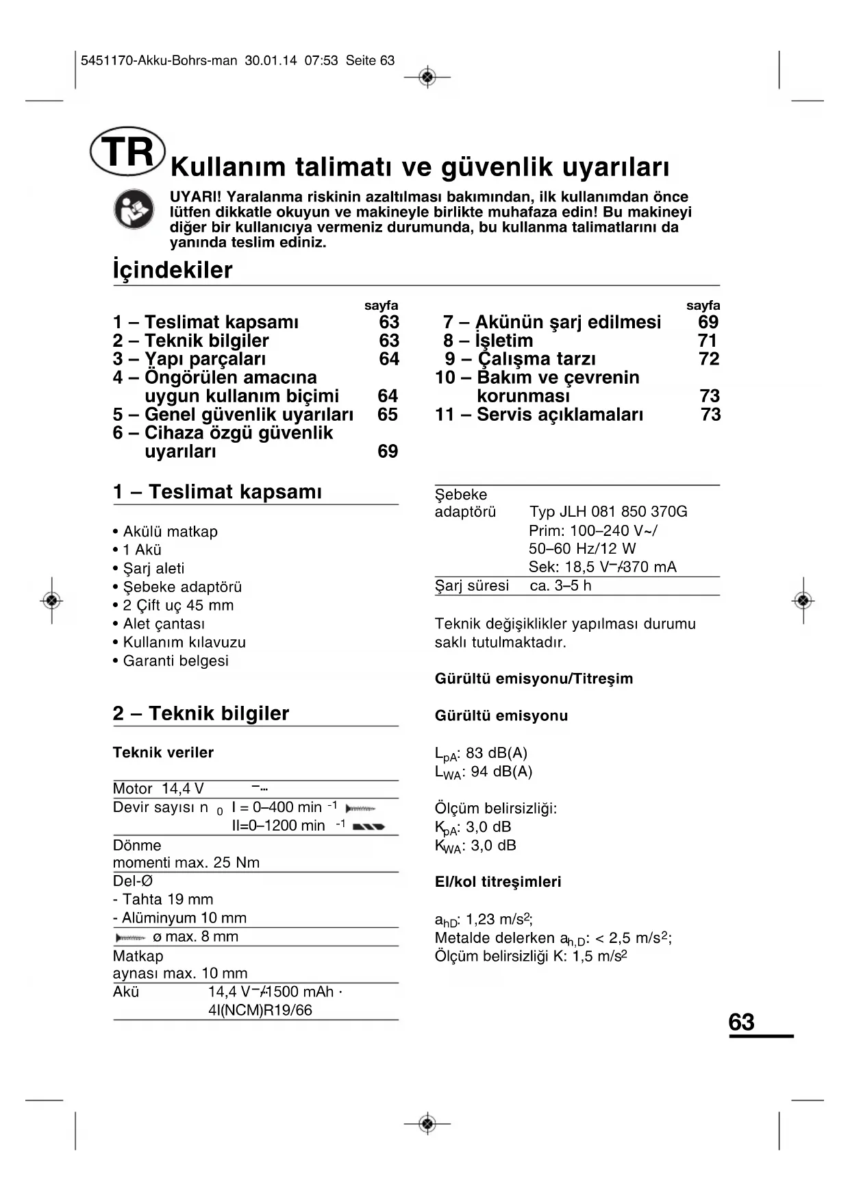 Kullanım talimat∂ ve güvenlik uyarıları UYARI! Yaralanma riskinin azalt∂lmas∂ bak∂m∂ndan, ilk kullan∂mdan öncelütfen dikkatle okuyun ve makineyle birlikte muhafaza edin! Bu makineyidiπer bir kullan∂c∂ya vermeniz durumunda, bu kullanma talimatlar∂n∂ dayan∂nda teslim ediniz. sayfa 1 – Teslimat kapsam∂ 63 2 – Teknik bilgiler 63 3 – Yap∂ parçalar∂ 64 4 – Öngörülen amac∂na uygun kullan∂m biçimi 64 5 – Genel güvenlik uyar∂lar∂ 65 6 – Cihaza özgü güvenlik uyar∂lar∂ 69 sayfa 7 – Akünün μarj edilmesi 69 8 – ∑μletim 71 9 – Çal∂μma tarz∂ 72 10 – Bak∂m ve çevrenin korunmas∂ 73 11 – Servis aç∂klamalar∂ 73 ∑çindekiler 5451170-Akku-Bohrs-man 30.01.14 07:53 Seite 6364 Ses/Titreμim bilgisi Ölçüm deπerleri z EN 60745-1 uyar∂nca tespit edilmiμtir. Belirtilen sal∂n∂m emisyon deπeri normland∂r∂lm∂μ bir test yöntemine göre ölçülmüμ olup, elektrikli bir aletin bir baμka aletle k∂yaslanmas∂nda kullan∂labilir. Belirtilen sal∂n∂m emisyon deπeri, muhtemel bir olumsuz etki için ilk tahmin olarak da kullan∂labilir. D∑KKAT! Sal∂n∂m emisyon deπeri, elektrikli aletin kullan∂lmas∂ s∂ras∂nda, aletin ne tür kullan∂ld∂π∂na baπl∂ olarak belirtilen deπerden farkl∂l∂k gösterebilir. Kullan∂c∂n∂n korunmas∂ aç∂s∂ndan güvenlik önlemleri belirlenmesi zorunludur. Burada, muhtemel olumsuz etki hakk∂nda reel uygulama koμullar∂ gözönüne al∂narak tahmin yap∂l∂r. (Bunda iμletim döngüsünün pay∂ da, yani aletin kapal∂ olduπu süreler ve de aletin gerçi aç∂k olduπu ama herhangi bir zorlanma olmadan çal∂μt∂π∂ süreler de dikkate al∂nmal∂d∂r.) 3 – Yap∂ parçalar∂ 1 Matkap aynas∂ 2 Dönme momenti ayar∂ 16+1 3 Açma-/Kapatma μalteri 4 Saπa/Sola hareket 5 Akü 6 Ωarj aleti 7 Ωebeke adaptörü 8 Ωarj fiμi 9 Kilit açma düπmesi 10 SPEED μalteri (1./2.devir) 11 M∂knat∂sl∂ altl∂k 12 Akü μarj göstergesi 13 Ωarj kontrol-LED 14 LED çal∂μma lâmbas∂ 15 2 Çift uç 45 mm 4 – Öngörülen amaçlara uygun kullan∂m Tahta ve metalde delme iμlemi, vidalama. Makineyi, μarj aletini ve aksesuarlar∂n∂ sadece amaca uygun μekilde kullan∂n∂z (üretici bilgilerini de dikkate al∂n∂z)! Amac∂ d∂μ∂nda tüm kullan∂mlar yasakt∂r. Bu alet sadece evde yapılacak olan iμlerde kullanılmak için belirlenmiμtir. Bu cihaz, güvenliklerinden sorumlu bir kiμinin denetimi olmaks∂z∂n ya da bu kiμi taraf∂ndan cihaz∂n nas∂l kullan∂lacaπ∂ tarif edilmeden s∂n∂rl∂ fiziki, duyusal veya zihinsel yetilere sahip kiμiler (çocuklar dahil) taraf∂ndan ya da tecrübesizce ve/veya bilgisizce kullan∂lamaz. Çocuklar∂n cihazla oynamamalar∂n∂n saπlanmas∂ aç∂s∂ndan kontrol alt∂nda tutulmas∂ gerekmektedir. Amac∂na uygun olmayan kullan∂m Cihaz∂n "Amac∂na uygun kullan∂m" bölümünde belirtilmeyen her tür kullan∂m∂ amac∂na uygun olmayan kullan∂md∂r. Bu elektrikli aletle öngörülmeyen uygulamalarda bulunulmas∂, tehlike ve yaralanmalara yol açabilir. Özel olarak bu elektrikli alet için öngörülmemiμ olan aksam∂ kullanmay∂n∂z. Bu takdirde yaralanma tehlikesi vard∂r. Hatal∂ kullan∂mdan dolay∂ meydana gelebilecek tüm maddi hasarlardan veya yaralanmalardan, cihaz∂ kullanan∂n kendisi sorumluluk taμ∂r. 5451170-Akku-Bohrs-man 30.01.14 07:53 Seite 6465 Makinede baμka veya orijinal olmayan parçalar∂n kullan∂lmas∂, üretici taraf∂ndan verilen garantinin yanmas∂na yol açar. Muhtemel riskler: ∑μbu elektrikli aletin iμletme talimat∂, elektrikli aletlerin emniyetli kullan∂labilmesine iliμkin önemli uyar∂lar içerir. Yine de her elektrikli alet, mevcut koruyucu tertibatlara raπmen tamamen ihtimal d∂μ∂ b∂rak∂lamayacak muhtemel riskler içerir. O nedenle elektrikli aletleri her zaman gereken itinayla kullan∂n∂z. Muhtemel riskler örneπin μunlar olabilir: