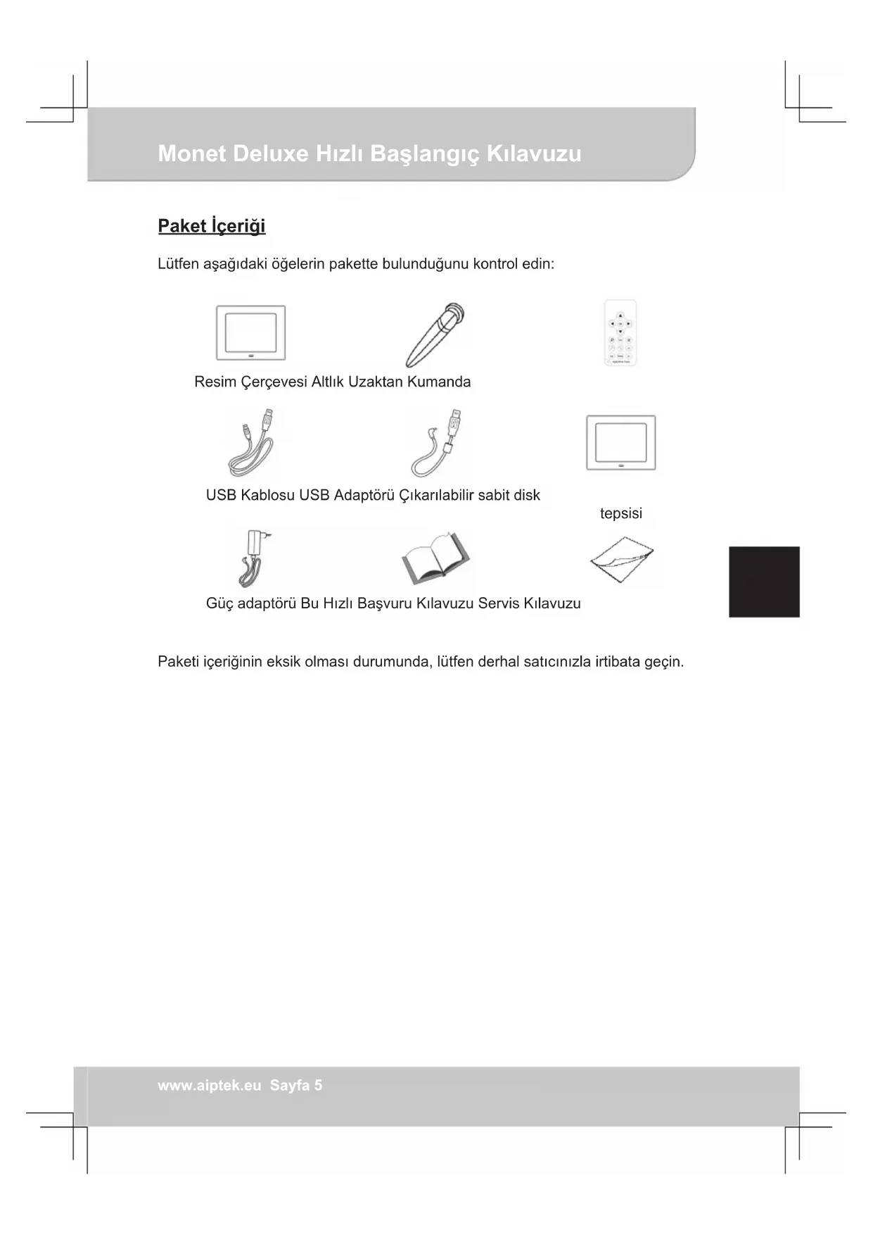 Ürünün kullanım ömrü sona erdiğinde, mümkünse tüm bileşenleri geri dönüştürmeye çalışın. Piller ve yeniden şarj edilebilir piller ev atıklarıyla atılmamalıdır. Lütfen yerel geri dönüşüm merkezine atın. Birlikte çevremizi korumaya katkıda bulunalım.Monet Deluxe Hızlı Başlangıç Kılavuzu ENDEFRITTU www.aiptek.eu Sayfa 4 Monet Deluxe Hızlı Başlangıç Kılavuzu İçindekiler Önlemler ..................................................................................................Sayfa 3 Paket İçeriği .............................................................................................Sayfa 5 Resim Çerçevesine Genel Bakış .............................................................Sayfa 6 Altlığın Takılması .....................................................................................Sayfa 7 Çalıştırma ................................................................................................Sayfa 7 Bellek Kartını Takın ..................................................................................Sayfa 7 İşlev İncelemesi .......................................................................................Sayfa 8 Fotoğraf ...................................................................................................Sayfa 11 Müzik .......................................................................................................Sayfa 13 Video .......................................................................................................Sayfa 14 Desteklenen video biçimleri .....................................................................Sayfa 15 Dosya Yöneticisi ......................................................................................Sayfa 16 Ayarlar .....................................................................................................Sayfa 17 Bilgisayar Bağlantısı ................................................................................Sayfa 18 Teknik Özellikler.......................................................................................Sayfa 19 Garanti .....................................................................................................Sayfa 20 Teknik Veriler ...........................................................................................Sayfa 20Monet Deluxe Hızlı Başlangıç Kılavuzu ENDEFRITTU www.aiptek.eu Sayfa 5 Paket İçeriği Lütfen aşağıdaki öğelerin pakette bulunduğunu kontrol edin: Resim Çerçevesi Altlık Uzaktan Kumanda USB Kablosu USB Adaptörü Çıkarılabilir sabit disk tepsisi Güç adaptörü Bu Hızlı Başvuru Kılavuzu Servis Kılavuzu Paketi içeriğinin eksik olması durumunda, lütfen derhal satıcınızla irtibata geçin.Monet Deluxe Hızlı Başlangıç Kılavuzu ENDEFRITTU www.aiptek.eu Sayfa 6 Monet Deluxe Hızlı Başlangıç Kılavuzu Resim Çerçevesine Genel Bakış Monet Deluxe, çalıştırma için birkaç bağlantı ve düğme sağlamaktadır: