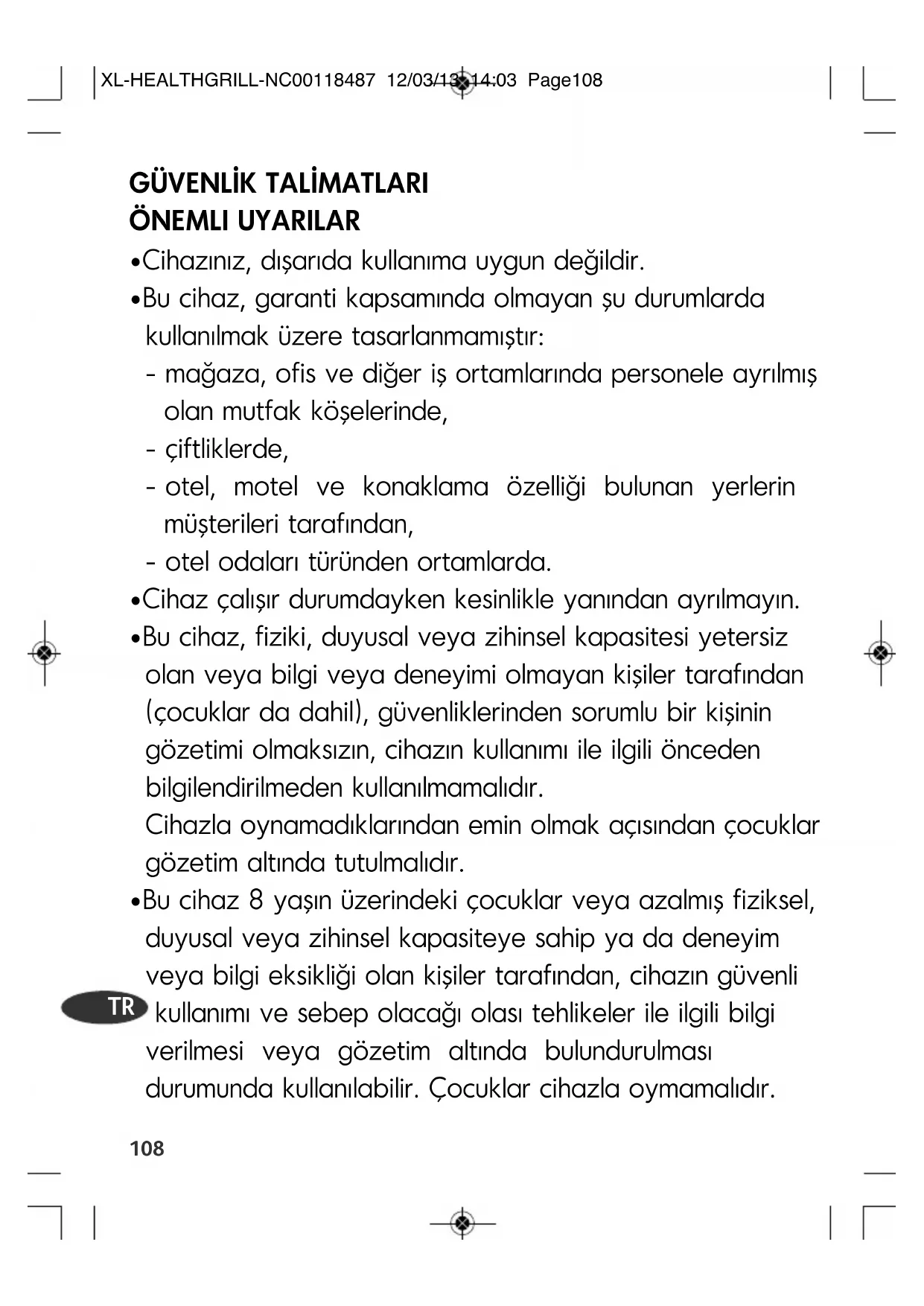 XL-HEALTHGRILL-NC00118487 12/03/13 14:03 Page108Temizlik ve kullanıcı bakımı, gözetim altında olmadıkları sürece 8 yaş altındaki çocuklar tarafından yapılmaz. Cihazı ve kablosunu 8 yaşın altındaki çocukların ulaşabileceği yerlerden uzak tutun.