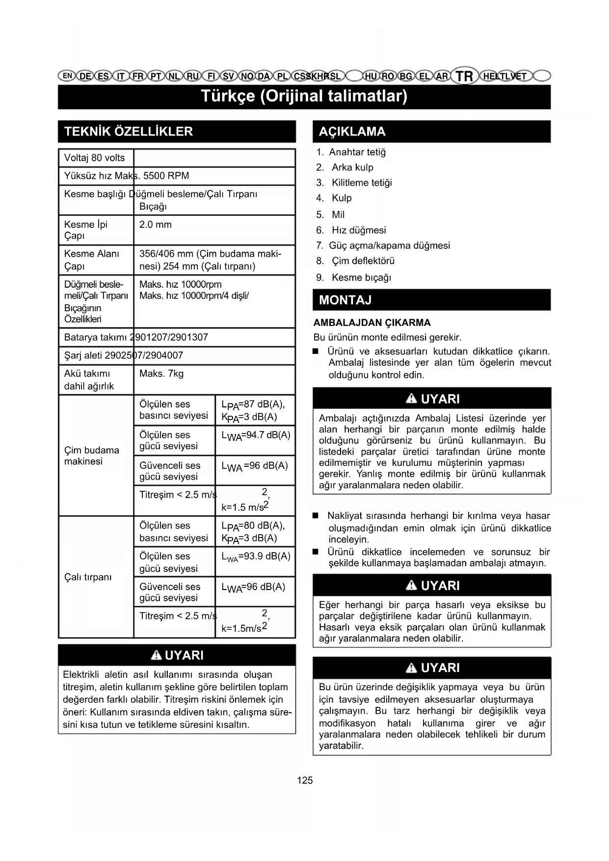 MONTAJ AMBALAJDAN ÇIKARMA Bu ürünün monte edilmesi gerekir. Ürünü ve aksesuarları kutudan dikkatlice çıkarın. Ambalaj listesinde yer alan tüm ögelerin mevcut olduğunu kontrol edin. UYARI Ambalajı açtığınızda Ambalaj Listesi üzerinde yer alan herhangi bir parçanın monte edilmiş halde olduğunu görürseniz bu ürünü kullanmayın. Bu listedeki parçalar üretici tarafından ürüne monte edilmemiştir ve kurulumu müşterinin yapması gerekir. Yanlış monte edilmiş bir ürünü kullanmak ağır yaralanmalara neden olabilir. Nakliyat sırasında herhangi bir kırılma veya hasar oluşmadığından emin olmak için ürünü dikkatlice inceleyin. Ürünü dikkatlice incelemeden ve sorunsuz bir şekilde kullanmaya başlamadan ambalajı atmayın. UYARI Eğer herhangi bir parça hasarlı veya eksikse bu parçalar değiştirilene kadar ürünü kullanmayın. Hasarlı veya eksik parçaları olan ürünü kullanmak ağır yaralanmalara neden olabilir. UYARI Bu ürün üzerinde değişiklik yapmaya veya bu ürün için tavsiye edilmeyen aksesuarlar oluşturmaya çalışmayın. Bu tarz herhangi bir değişiklik veya modikasyon hatalı kullanıma girer ve ağır yaralanmalara neden olabilecek tehlikeli bir durum yaratabilir.Türkçe (Orijinal talimatlar)