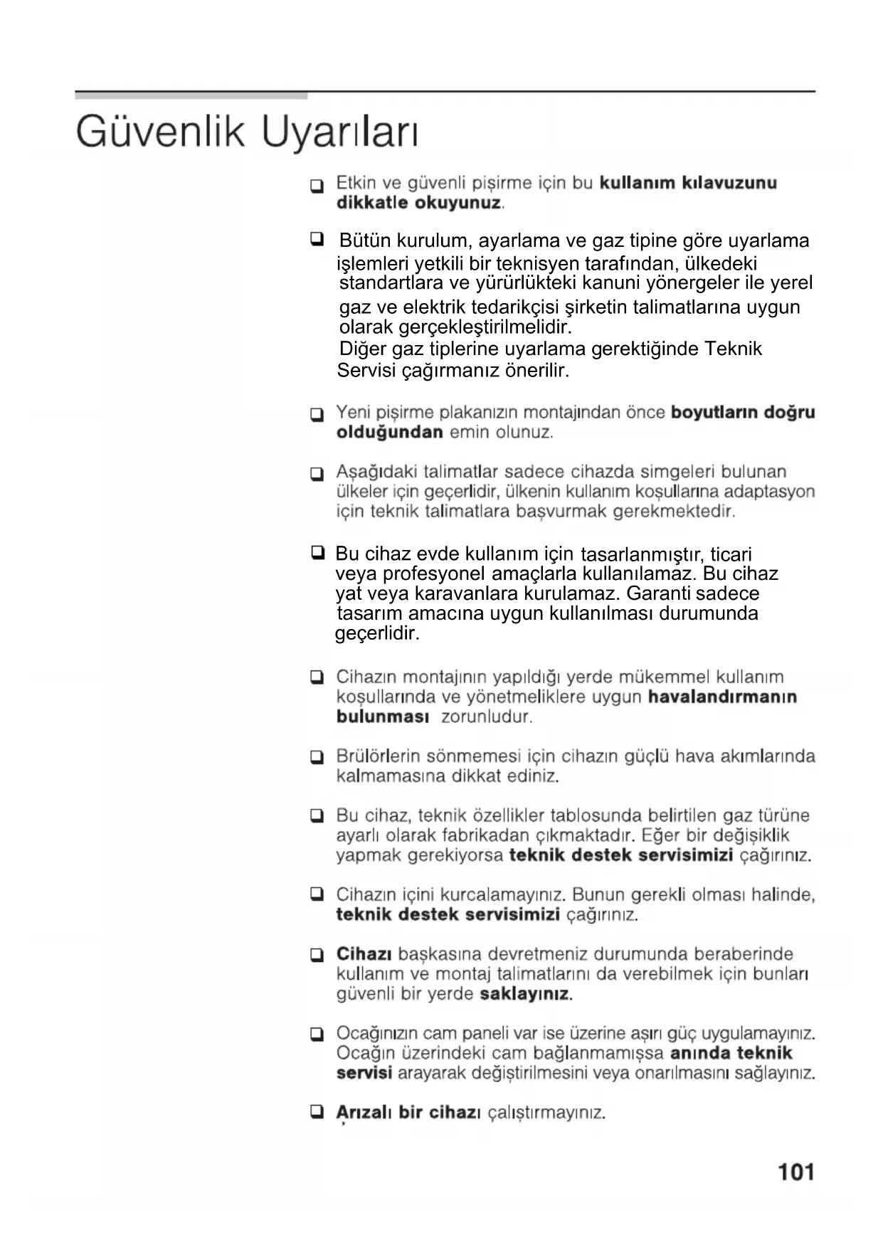 Beklentilerimizin aksine cihaz herhangi bir arıza çıkarırsa veya bilgilendiriniz. Elle müdahale edilmiş veya yanlış kullanıma maruz kalmış cihazlar garanti kapsamı dışındadır. ÖNEMLİ: ihtiyaçları öngörülen kalitede karşılayamazsa, lütfen en kısa sürede bizistandartlara ve yürürlükteki kanuni yönergeler ile yerel Diğer gaz tiplerine uyarlama gerektiğinde Teknik Servisi çağırmanız önerilir. gaz ve elektrik tedarikçisi şirketin talimatlarına uygun olarak gerçekleştirilmelidir. işlemleri yetkili bir teknisyen tarafından, ülkedeki Bütün kurulum, ayarlama ve gaz tipine göre uyarlama tasarlanmıştır, ticari veya profesyonel yat veya karavanlara kurulamaz. Garanti amaçlarla kullanılamaz. Bu cihaz sadece tasarım amacına uygun Bu cihaz evde kullanım için kullanılması durumunda geçerlidir.Elektrik çarpması riski oluşturabileceği için, pişirme plakasını temizlemek üzere buharlı temizleme makinaları kullanmayınız. DAHA ÖNCE BELİRTİLMİŞ OLAN GÜVENLİK UY ARILARINA UYULMAMASI HALİNDE,
