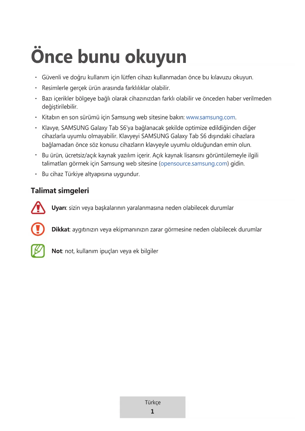 Klavye, SAMSUNG Galaxy Tab S6'ya bağlanacak şekilde optimize edildiğinden diğer cihazlarla uyumlu olmayabilir. Klavyeyi SAMSUNG Galaxy Tab S6 dışındaki cihazlara bağlamadan önce söz konusu cihazların klavyeyle uyumlu olduğundan emin olun.