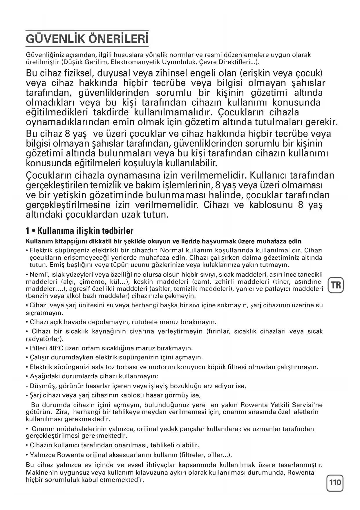 Güvenliğiniz açısından, ilgili hususlara yönelik normlar ve resmi düzenlemelere uygun olarak üretilmiştir (Düşük Gerilim, Elektromanyetik Uyumluluk, Çevre Direktifleri...). Bu cihaz fiziksel, duyusal veya zihinsel engeli olan (erişkin veya çocuk) veya cihaz hakkında hiçbir tecrübe veya bilgisi olmayan şahıslar tarafından, güvenliklerinden sorumlu bir kişinin gözetimi altında olmadıkları veya bu kişi tarafından cihazın kullanımı konusunda eğitilmedikleri takdirde kullanılmamalıdır. Çocukların cihazla oynamadıklarından emin olmak için gözetim altında tutulmaları gerekir. Bu cihaz 8 ya ş ve üzeri çocuklar ve cihaz hakkında hiçbir tecrübe veya bilgisi olmayan şahıslar tarafından, güvenliklerinden sorumlu bir kişinin gözetimi altında bulunmaları veya bu kişi tarafından cihazın kullanımı konusunda eğitilmeleri koşuluyla kullanılabilir. Çocukların cihazla oynamasına izin verilmemelidir. Kullanıcı tarafından gerçekleştirilen temizlik ve bakım işlemlerinin, 8 yaş veya üzeri olmaması ve bir yetişkin gözetiminde bulunmaması halinde, çocuklar tarafından gerçekleştirilmesine izin verilmemelidir. Cihazı ve kablosunu 8 yaş altındaki çocuklardan uzak tutun. 1 • Kullanıma ilişkin tedbirler Kullanım kitapçığını dikkatli bir şekilde okuyun ve ileride başvurmak üzere muhafaza edin