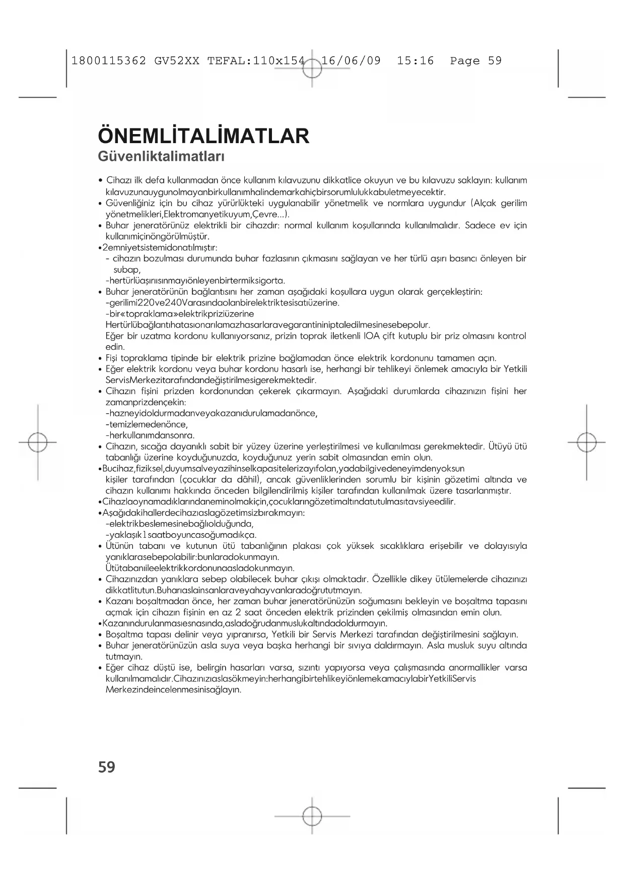 - Eğer cihaz düştü ise, belirgin hasarları varsa, sızıntı yapıyorsa veya çalışmasında anormallikler varsa kullanılmamalıdır. Cihazınızı asla sökmeyin: herhangi bir tehlikeyi önlemek amacıyla bir Yetkili ServisMerkezinde incelenmesini sağlayın. 1800115362 GV52XX TEFAL:110x154 16/06/09 15:16 Page 5960