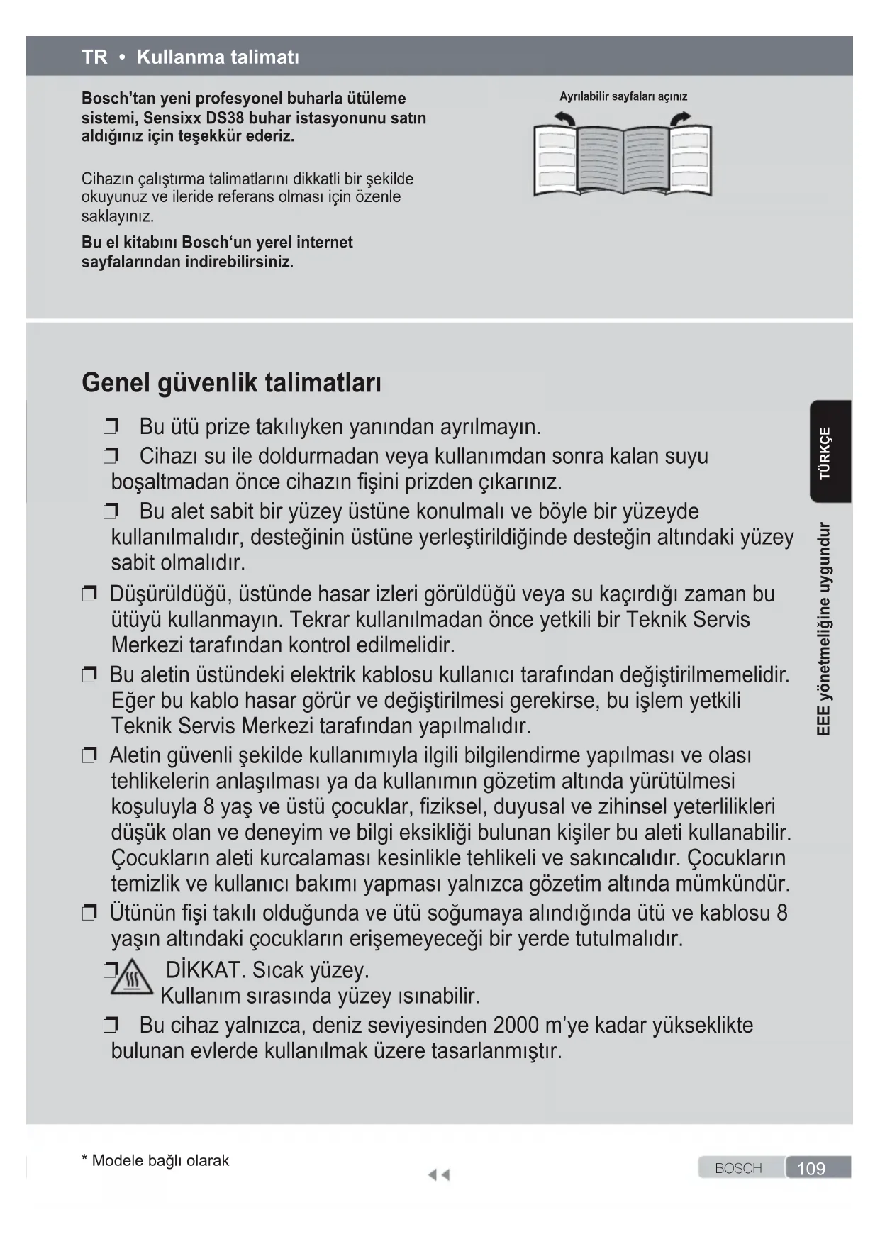 B O S C H* Modele bağlı olarakTÜrkçE EEE yönetmeliğine uygundur Bosch’tan yeni profesyonel buharla ütüleme sistemi, Sensixx DS38 buhar istasyonunu satın aldığınız için teşekkür ederiz. Cihazın çalıştırma talimatlarını dikkatli bir şekilde okuyunuz ve ileride referans olması için özenle saklayınız. Bu el kitabını Bosch‘un yerel internet sayfalarından indirebilirsiniz. Ayrılabilir sayfaları açınız Genel güvenlik talimatları ❐ Bu ütü prize takılıyken yanından ayrılmayın. ❐ Cihazı su ile doldurmadan veya kullanımdan sonra kalan suyu boşaltmadan önce cihazın fişini prizden çıkarınız. ❐ Bu alet sabit bir yüzey üstüne konulmalı ve böyle bir yüzeyde kullanılmalıdır, desteğinin üstüne yerleştirildiğinde desteğin altındaki yüzey sabit olmalıdır. ❐ Düşürüldüğü, üstünde hasar izleri görüldüğü veya su kaçırdığı zaman bu ütüyü kullanmayın. Tekrar kullanılmadan önce yetkili bir Teknik Servis Merkezi tarafından kontrol edilmelidir. ❐ Bu aletin üstündeki elektrik kablosu kullanıcı tarafından değiştirilmemelidir. Eğer bu kablo hasar görür ve değiştirilmesi gerekirse, bu işlem yetkili Teknik Servis Merkezi tarafından yapılmalıdır. ❐ Aletin güvenli şekilde kullanımıyla ilgili bilgilendirme yapılması ve olası tehlikelerin anlaşılması ya da kullanımın gözetim altında yürütülmesi koşuluyla 8 yaş ve üstü çocuklar, fiziksel, duyusal ve zihinsel yeterlilikleri düşük olan ve deneyim ve bilgi eksikliği bulunan kişiler bu aleti kullanabilir. Çocukların aleti kurcalaması kesinlikle tehlikeli ve sakıncalıdır. Çocukların temizlik ve kullanıcı bakımı yapması yalnızca gözetim altında mümkündür. ❐ Ütünün fişi takılı olduğunda ve ütü soğumaya alındığında ütü ve kablosu 8 yaşın altındaki çocukların erişemeyeceği bir yerde tutulmalıdır.