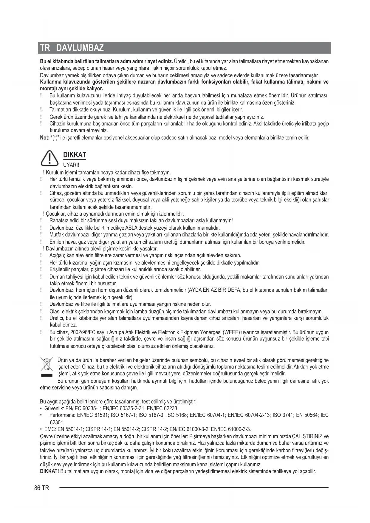 - EMC: EN 55014-1; CISPR 14-1; EN 55014-2; CISPR 14-2; EN/IEC 61000-3-2; EN/IEC 61000-3-3. Çevre üzerine etkiyi azaltmak amacıyla doğru bir kullanım için öneriler: Pişirmeye başlarken davlumbazı minimum hızda ÇALIŞTIRINIZ ve pişirme işlemi bittikten sonra birkaç dakika daha çalışır konumda bırakınız. Hızı yalnızca fazla miktarda duman ve buhar varsa arttırınız ve takviye hızı(ları) yalnızca uç durumlarda kullanınız. İyi bir koku azaltma etkinliğinin korunması için gerektiğinde karbon ltreyi(leri) değiş- tiriniz. İyi bir yağ ltresi etkinliğinin korunması için gerektiğinde yağ ltresini(lerini) temizleyiniz. Etkinliğini optimize etmek ve gürültüyü en düşük seviyeye indirmek için bu kullanım kılavuzunda belirtilen maksimum kanal sistemi çapını kullanınız. DIKKAT! Bu talimatlara uygun olarak, montaj için vida ve diğer parçaların yerleştirilmemesi elektrik sisteminde tehlikeye yol açabilir.87TR KULLANIM Davlumbaz, havayı dışarı atıcı veya ltre edici model olarak tasarlanmıştır. Aspiratörlü model Yemek buharları, bağlantı falanjına sabitlenmiş bir tahliye borusu sayesinde dışarıya atılırlar. Tahliye borusunun çapı bağlantı halkasının çapına eşit olmalıdır. Dikkat! Tahliye borusu ürün ile birlikte tedarik edilmez. Ayrıca satın alınmalıdır. Yatay satıhda boru, havayı dışarıya kolayca taşıyabilmesi için yukarı doğru haf bir açıya sahip olmalıdır ( yaklaşık 10°). Eğer davlumbazın karbon ltreleri var ise bunlar çıkartılmalıdır. Davlumbazı duvardaki çıkış borularına ve ağızlarına bağlayınız. Diametresi hava çıkışıyla aynı olmalıdır (bağlantı halkası). Boruların ve duvardaki az çaplı çıkış borularının emme gücünün iyi çalışmasını azaltır ve gürültüyü büyük ölçüde arttırır. Dolayısıyla bu konuyla ilgili hiçbir mesuliyet kabul edilmez. ! ! Mümkün olan en kısa boyda tahliye borusu kullanın ! ! En az sayıda dirseğe sahip boru kullanın (Maksimum dirsek açısı: 90°). ! ! Borunun kesitinin ( genişliğinin ) ani olarak değişmesinden kaçının. ! ! İç yüzeyi mümkün olan en pürüzsüz boruyu tercih edin. ! ! Borunun yapıldığı malzeme yasaların onayladığı türden olmalıdır. Filtreli model Aspire edilen hava, odaya tekrar aktarılmadan önce içerdiği kokusundan ve yağdan arıtılacaktır. Bu versiyonda davlumbaz kullanmak için aktif karbon bazlı bir ltre sisteminin takılması gerekir. KURULUM Ocağın üzerindeki pişirme kapları için destek yüzeyleri ile ocak davlumbazının en alçak kısmı arasındaki minimum mesafe, elektrikli ısıtı- cılardan 55cm, gaz veya gazla-elektrikle çalışan ocaklardan 50 cm’den az olmamalıdır. Gazlı ocakların kurulumuyla ilgili olarak talimatlarda daha fazla mesafe belirtiliyorsa, buna bağlı kalınmalıdır. Elektrikbağlantısı Ana güç kaynağı davlumbazın içinde yer alan plakada belirtilen değere uygun olmalıdır. Davlumbazı varsa bir ş ile mevcut düzenlemelere uygun bir prize takıp erişilebilir bir alana yerleştiriniz. Kurulumdan sonra da eğer cihazın şi yok ise (doğrudan şebeke bağlantısı) veya priz erişilebilir bir yerde değilse, aşırı akım kategorisi III ile ilgili koşullar altında ana kablonun bağlantısının tamamen kesilmesini sağlayan, standartlara uygun çift kutuplu bir anahtar kullanın. Uyarı:Davlumbazı ana güç kaynağına yeniden bağlamadan ve etkin şekilde çalıştığını kontrol etmeden önce, ana güç kaynağı kablosunun düzgün takılıp takılmadığını denetleyin. Davlumbaz özel bir elektrik kablosuna sahiptir; Bu kablonun hasar görmesi durumunda yetkili teknik servise başvurun. Montaj Bu ürün son derece ağırdır, taşınması ve kurulması en az iki yada daha fazla sayıda personel tarafından yapılmalıdır. Montaja başlamadan önce: