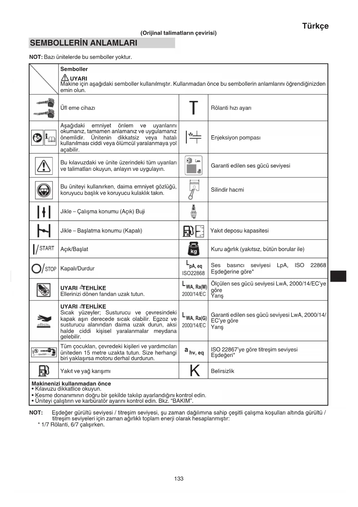 NOT: Bazı ünitelerde bu semboller yoktur. Semboller UYARI Makine için aşağıdaki semboller kullanılmıştır. Kullanmadan önce bu sembollerin anlamlarını öğrendiğinizden emin olun. Üfl eme cihazı Rölanti hızı ayarı Aşağıdaki emniyet önlem ve uyarılarını okumanız, tamamen anlamanız ve uygulamanız önemlidir. Ünitenin dikkatsiz veya hatalı kullanılması ciddi veya ölümcül yaralanmaya yol açabilir. Enjeksiyon pompası Bu kılavuzdaki ve ünite üzerindeki tüm uyarıları ve talimatları okuyun, anlayın ve uygulayın. Garanti edilen ses gücü seviyesi Bu üniteyi kullanırken, daima emniyet gözlüğü, koruyucu başlık ve koruyucu kulaklık takın. Silindir hacmi Jikle – Çalışma konumu (Açık) Buji Jikle – Başlatma konumu (Kapalı) Yakıt deposu kapasitesi START Açık/Başlat Kuru ağırlık (yakıtsız, bütün borular ile) STOP Kapalı/Durdur