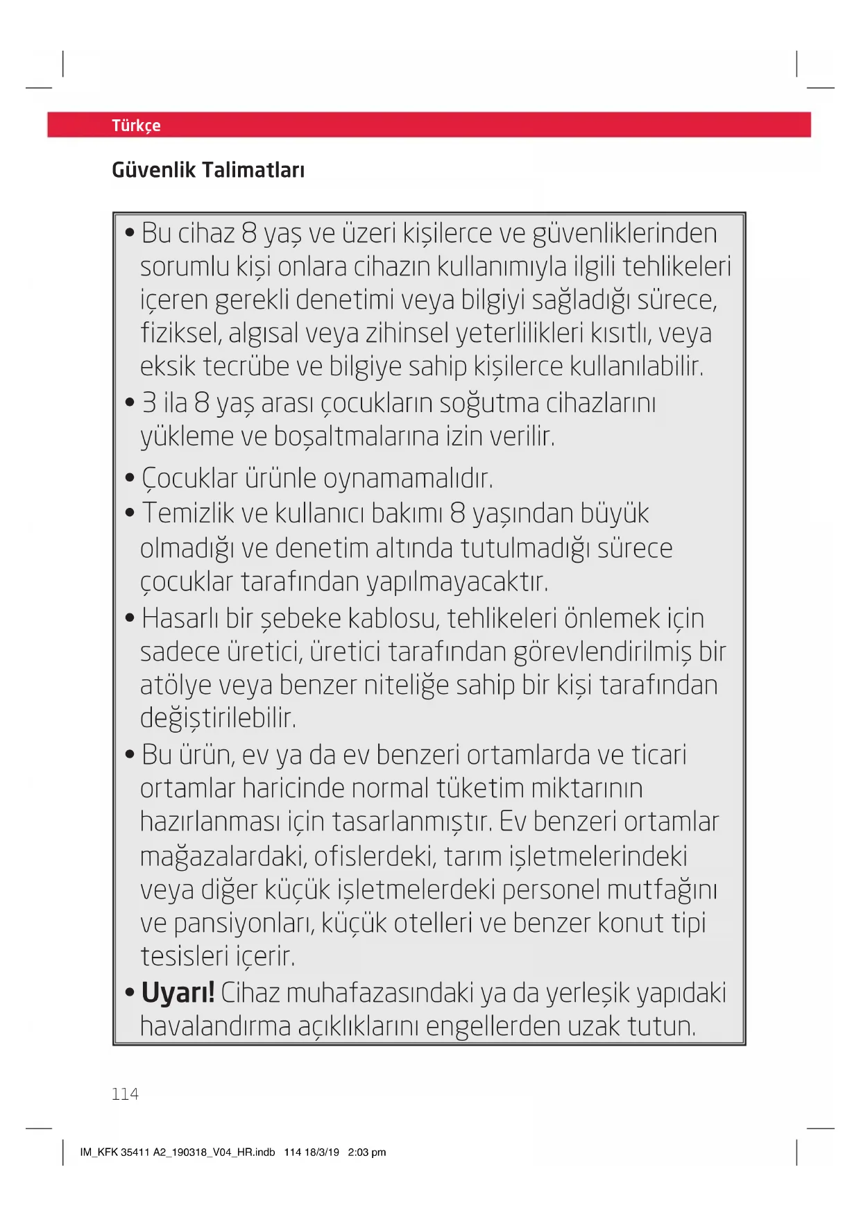 - Uyarı! Cihaz muhafazasındaki ya da yerleşik yapıdaki havalandırma açıklıklarını engellerden uzak tutun. IM_KFK 35411 A2_190318_V04_HR.indb 114 18/3/19 2:03 pmTürkçe