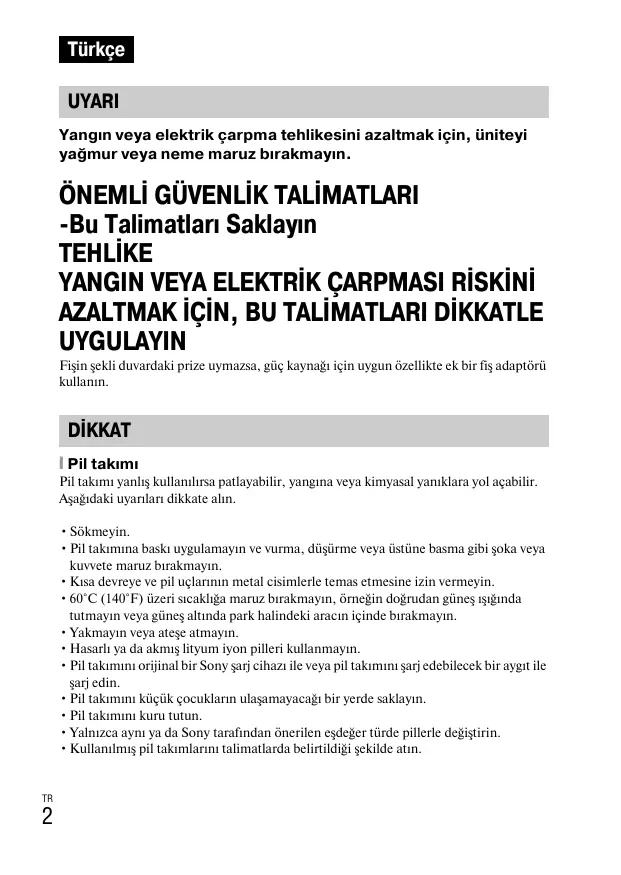 Bu Talimatları Saklayın TEHLİKE YANGIN VEYA ELEKTRİK ÇARPMASI RİSKİNİ AZALTMAK İÇİN, BU TALİMATLARI DİKKATLE UYGULAYIN Fişin şekli duvardaki prize uymazsa, güç kaynağı için uygun özellikte ek bir fiş adaptörü kullanın. DİKKAT [ Pil takımı Pil takımı yanlış kullanılırsa patlayabilir, yangına veya kimyasal yanıklara yol açabilir. Aşağıdaki uyarıları dikkate alın.