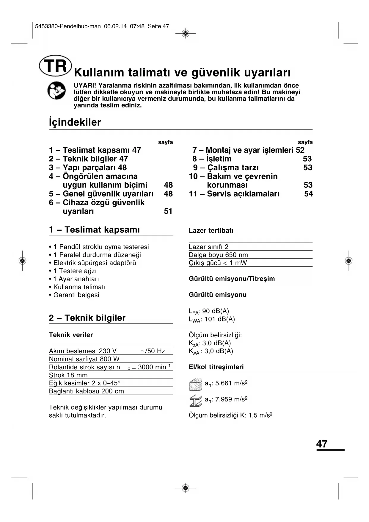 Kullanım talimat∂ ve güvenlik uyarıları UYARI! Yaralanma riskinin azalt∂lmas∂ bak∂m∂ndan, ilk kullan∂mdan öncelütfen dikkatle okuyun ve makineyle birlikte muhafaza edin! Bu makineyidiπer bir kullan∂c∂ya vermeniz durumunda, bu kullanma talimatlar∂n∂ dayan∂nda teslim ediniz. sayfa 1 – Teslimat kapsam∂ 47 2 – Teknik bilgiler 47 3 – Yap∂ parçalar∂ 48 4 – Öngörülen amac∂na uygun kullan∂m biçimi 48 5 – Genel güvenlik uyar∂lar∂ 48 6 – Cihaza özgü güvenlik uyar∂lar∂ 51 sayfa 7 – Montaj ve ayar iμlemleri 52 8 – ∑μletim 53 9 – Çal∂μma tarz∂ 53 10 – Bak∂m ve çevrenin korunmas∂ 53 11 – Servis aç∂klamalar∂ 54 ∑çindekiler