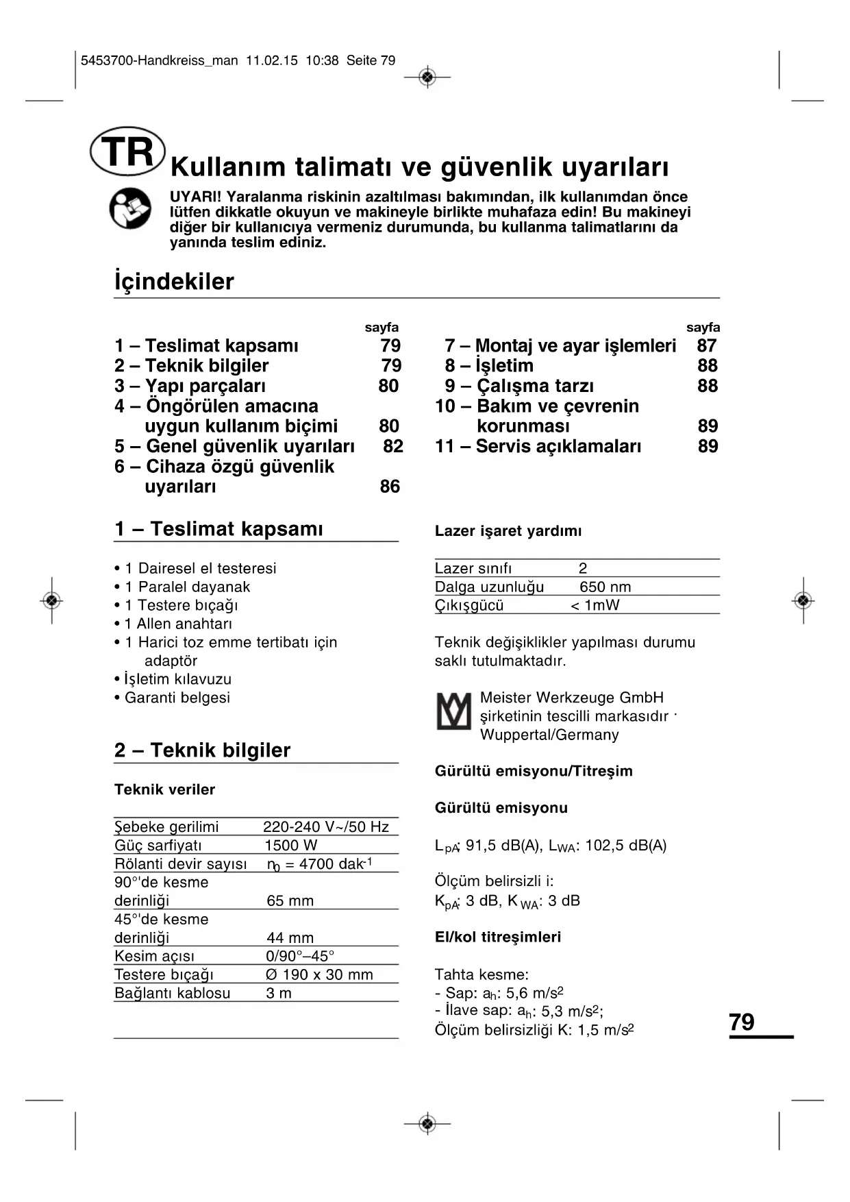 - 1 Dairesel el testeresi• 1 Paralel dayanak• 1 Testere bıçağı• 1 Allen anahtarı• 1 Harici toz emme tertibatı içinadaptör• İşletim kılavuzu• Garanti belgesi 2 – Teknik bilgiler Teknik verilerŞebeke gerilimi 220-240 V~/50 HzGüç sarfiyatı 1500 WRölanti devir sayısı n = 4700 dak 90°'de kesmederinliği 65 mm45°'de kesmederinliği 44 mmKesim açısı 0/90°–45° Testere bıçağı Ø 190 x 30 mm Bağlantı kablosu 3 mLazer iμaret yard∂m∂Lazer sınıfı 2Dalga uzunluğu 650 nmÇıkış gücü < 1mWTeknik deπiμiklikler yap∂lmas∂ durumusakl∂ tutulmaktad∂r.Meister Werkzeuge GmbHμirketinin tescilli markas∂d∂r ·Wuppertal/GermanyGürültü emisyonu/TitreμimGürültü emisyonu