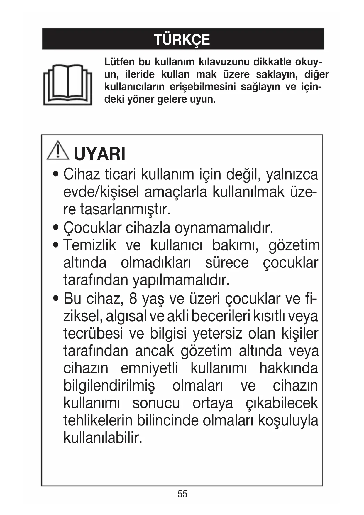 ziksel, algısal ve akli becerileri kısıtlı veya tecrübesi ve bilgisi yetersiz olan kişiler tarafından ancak gözetim altında veya cihazın emniyetli kullanımı hakkında bilgilendirilmiş olmaları ve cihazın kullanımı sonucu ortaya çıkabilecek tehlikelerin bilincinde olmaları koşuluyla kullanılabilir. Lütfen bu kullanım kılavuzunu dikkatle okuy- un, ileride kullan mak üzere saklayın, diğer kullanıcıların erişebilmesini sağlayın ve için