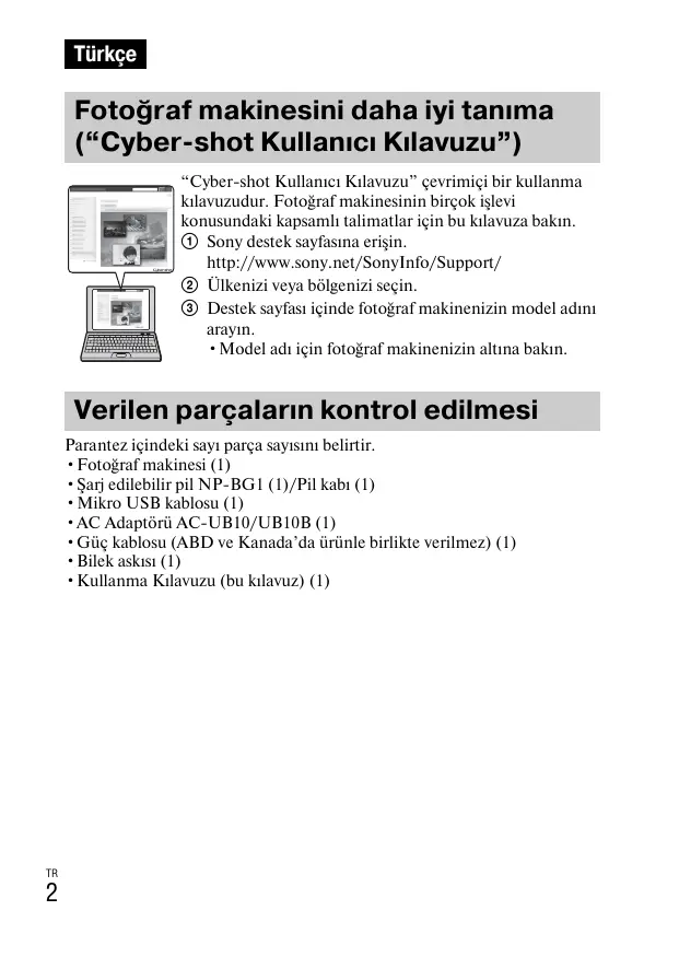 Türkçe Fotoğraf makinesini daha iyi tanıma (“Cybershot Kullanıcı Kılavuzu”) “Cybershot Kullanıcı Kılavuzu” çevrimiçi bir kullanma kılavuzudur. Fotoğraf makinesinin birçok işlevi konusundaki kapsamlı talimatlar için bu kılavuza bakın. 1 Sony destek sayfasına erişin. http://www.sony.net/SonyInfo/Support/ 2 Ülkenizi veya bölgenizi seçin. 3 Destek sayfası içinde fotoğraf makinenizin model adını arayın.