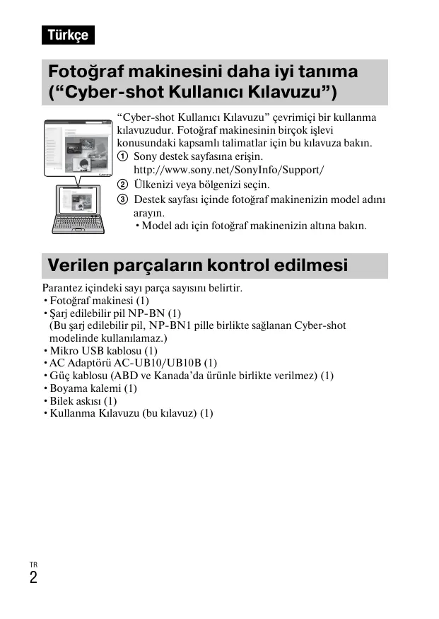 Türkçe Fotoğraf makinesini daha iyi tanıma (“Cybershot Kullanıcı Kılavuzu”) “Cybershot Kullanıcı Kılavuzu” çevrimiçi bir kullanma kılavuzudur. Fotoğraf makinesinin birçok işlevi konusundaki kapsamlı talimatlar için bu kılavuza bakın. 1 Sony destek sayfasına erişin. http://www.sony.net/SonyInfo/Support/ 2 Ülkenizi veya bölgenizi seçin. 3 Destek sayfası içinde fotoğraf makinenizin model adını arayın.