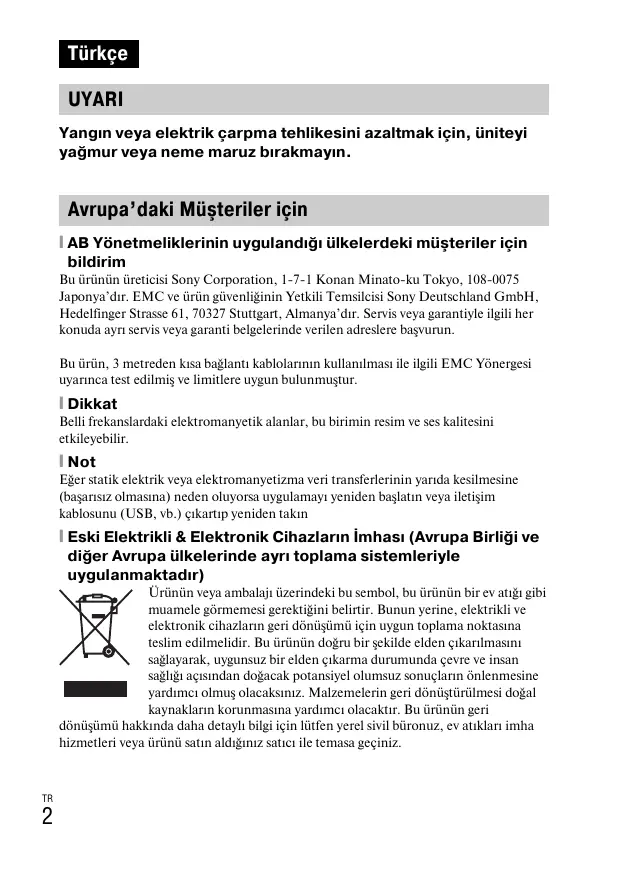 Türkçe UYARI Yangın veya elektrik çarpma tehlikesini azaltmak için, üniteyi yağmur veya neme maruz bırakmayın. Avrupa’daki Müşteriler için [ AB Yönetmeliklerinin uygulandığı ülkelerdeki müşteriler için bildirim Bu ürünün üreticisi Sony Corporation, 171 Konan Minatoku Tokyo, 1080075 Japonya’dır. EMC ve ürün güvenliğinin Yetkili Temsilcisi Sony Deutschland GmbH, Hedelfinger Strasse 61, 70327 Stuttgart, Almanya’dır. Servis veya garantiyle ilgili her konuda ayrı servis veya garanti belgelerinde verilen adreslere başvurun. Bu ürün, 3 metreden kısa bağlantı kablolarının kullanılması ile ilgili EMC Yönergesi uyarınca test edilmiş ve limitlere uygun bulunmuştur. [ Dikkat Belli frekanslardaki elektromanyetik alanlar, bu birimin resim ve ses kalitesini etkileyebilir. [ Not Eğer statik elektrik veya elektromanyetizma veri transferlerinin yarıda kesilmesine (başarısız olmasına) neden oluyorsa uygulamayı yeniden başlatın veya iletişim kablosunu (USB, vb.) çıkartıp yeniden takın [ Eski Elektrikli & Elektronik Cihazların İmhası (Avrupa Birliği ve diğer Avrupa ülkelerinde ayrı toplama sistemleriyle uygulanmaktadır) Ürünün veya ambalajı üzerindeki bu sembol, bu ürünün bir ev atığı gibi muamele görmemesi gerektiğini belirtir. Bunun yerine, elektrikli ve elektronik cihazların geri dönüşümü için uygun toplama noktasına teslim edilmelidir. Bu ürünün doğru bir şekilde elden çıkarılmasını sağlayarak, uygunsuz bir elden çıkarma durumunda çevre ve insan sağlığı açısından doğacak potansiyel olumsuz sonuçların önlenmesine yardımcı olmuş olacaksınız. Malzemelerin geri dönüştürülmesi doğal kaynakların korunmasına yardımcı olacaktır. Bu ürünün geri dönüşümü hakkında daha detaylı bilgi için lütfen yerel sivil büronuz, ev atıkları imha hizmetleri veya ürünü satın aldığınız satıcı ile temasa geçiniz.