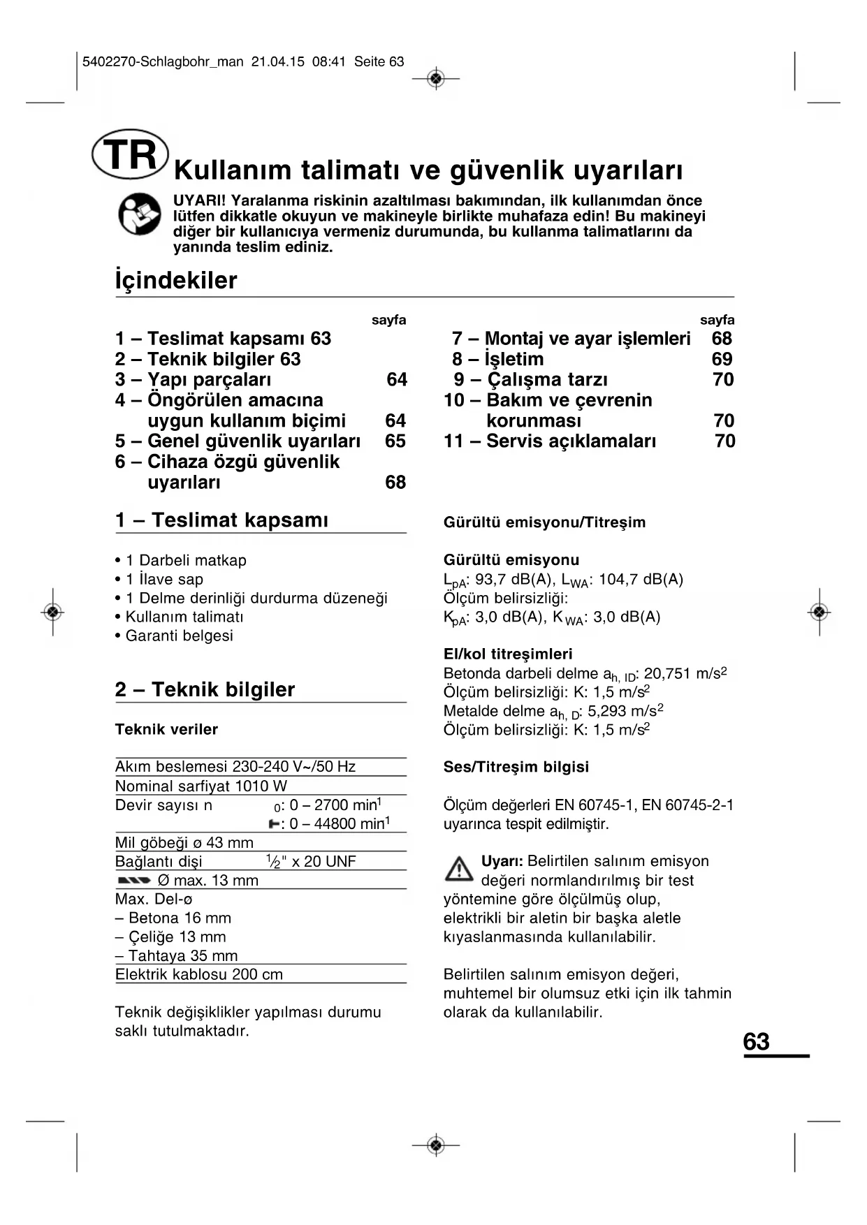 : 3,0 dB(A), K : 3,0 dB(A)El/kol titreμimleriBetonda darbeli delme ah, ID: 20,751 m/s Ölçüm belirsizliπi: K: 1,5 m/s Metalde delme a h, D : 5,293 m/s Ölçüm belirsizliπi: K: 1,5 m/s Ses/Titreμim bilgisiÖlçüm deπerleri EN 60745-1, EN 60745-2-1uyar∂nca tespit edilmiμtir.Uyar∂: Belirtilen sal∂n∂m emisyondeπeri normland∂r∂lm∂μ bir testyöntemine göre ölçülmüμ olup,elektrikli bir aletin bir baμka aletlek∂yaslanmas∂nda kullan∂labilir.Belirtilen sal∂n∂m emisyon deπeri,muhtemel bir olumsuz etki için ilk tahminolarak da kullan∂labilir. Kullanım talimat∂ ve güvenlik uyarıları UYARI! Yaralanma riskinin azalt∂lmas∂ bak∂m∂ndan, ilk kullan∂mdan öncelütfen dikkatle okuyun ve makineyle birlikte muhafaza edin! Bu makineyidiπer bir kullan∂c∂ya vermeniz durumunda, bu kullanma talimatlar∂n∂ dayan∂nda teslim ediniz. sayfa 1 – Teslimat kapsam∂ 63 2 – Teknik bilgiler 63 3 – Yap∂ parçalar∂ 64 4 – Öngörülen amac∂na uygun kullan∂m biçimi 64 5 – Genel güvenlik uyar∂lar∂ 65 6 – Cihaza özgü güvenlik uyar∂lar∂ 68 sayfa 7 – Montaj ve ayar iμlemleri 68 8 – ∑μletim 69 9 – Çal∂μma tarz∂ 70 10 – Bak∂m ve çevrenin korunmas∂ 70 11 – Servis aç∂klamalar∂ 70 ∑çindekiler 5402270-Schlagbohr_man 21.04.15 08:41 Seite 6364 Makinenin kullan∂ld∂π∂ s∂radaki reel titreμim emisyon deπeri, iμletme tâlimat∂ndaki veya üretici taraf∂ndan verilen deπerlerden sapma gösterebilir. Bu, her kullan∂mdan önce veya kullan∂m esnas∂nda dikkate al∂nmas∂ gereken aμaπ∂daki faktörlerden kaynaklanabilir: