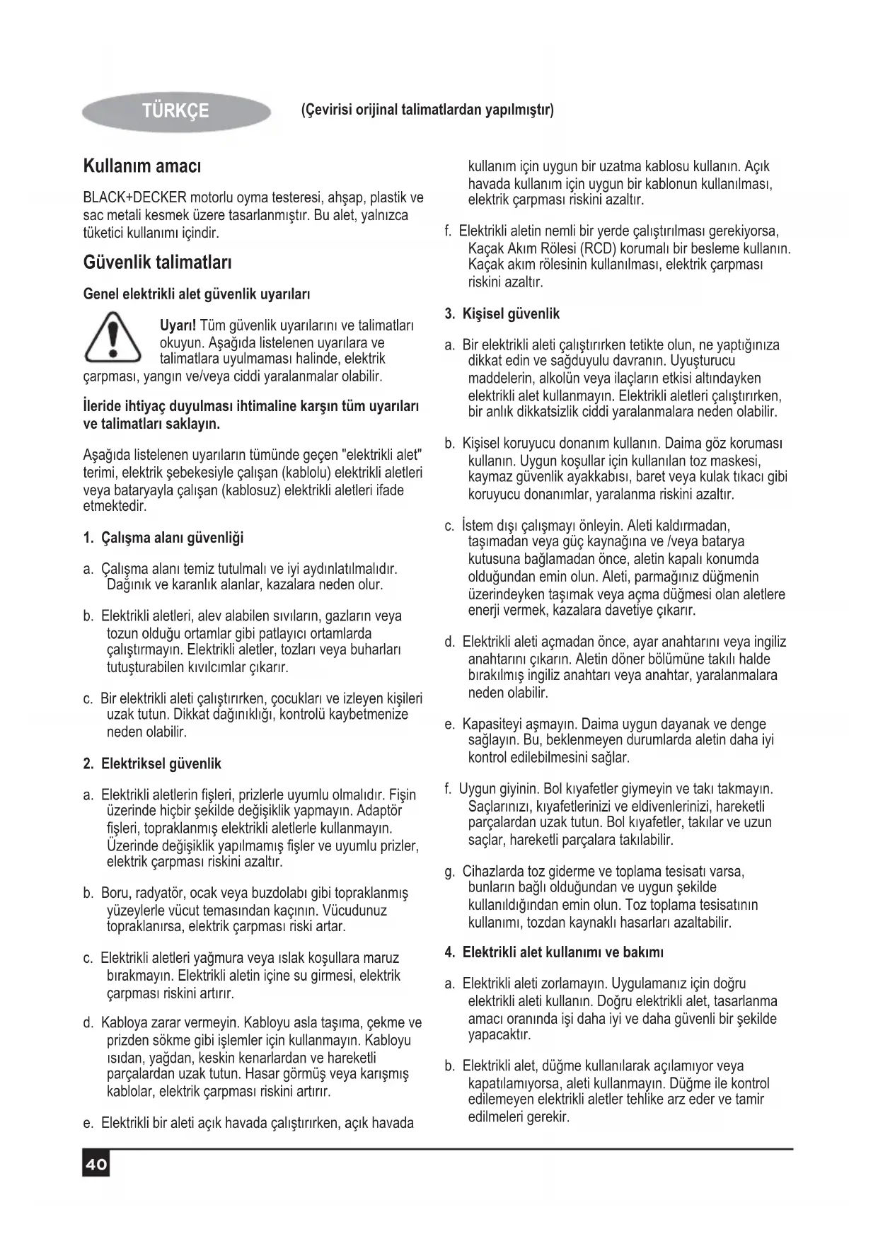 (Çevirisi orijinal talimatlardan yapılmıştır) Kullanım amacı BLACK+DECKER motorlu oyma testeresi, ahşap, plastik ve sac metali kesmek üzere tasarlanmıştır. Bu alet, yalnızca tüketici kullanımı içindir. Güvenlik talimatları Genel elektrikli alet güvenlik uyarıları Uyarı! Tüm güvenlik uyarılarını ve talimatları okuyun. Aşağıda listelenen uyarılara ve talimatlara uyulmaması halinde, elektrik çarpması, yangın ve/veya ciddi yaralanmalar olabilir. İleride ihtiyaç duyulması ihtimaline karşın tüm uyarıları ve talimatları saklayın. Aşağıda listelenen uyarıların tümünde geçen "elektrikli alet" terimi, elektrik şebekesiyle çalışan (kablolu) elektrikli aletleri veya bataryayla çalışan (kablosuz) elektrikli aletleri ifade etmektedir.