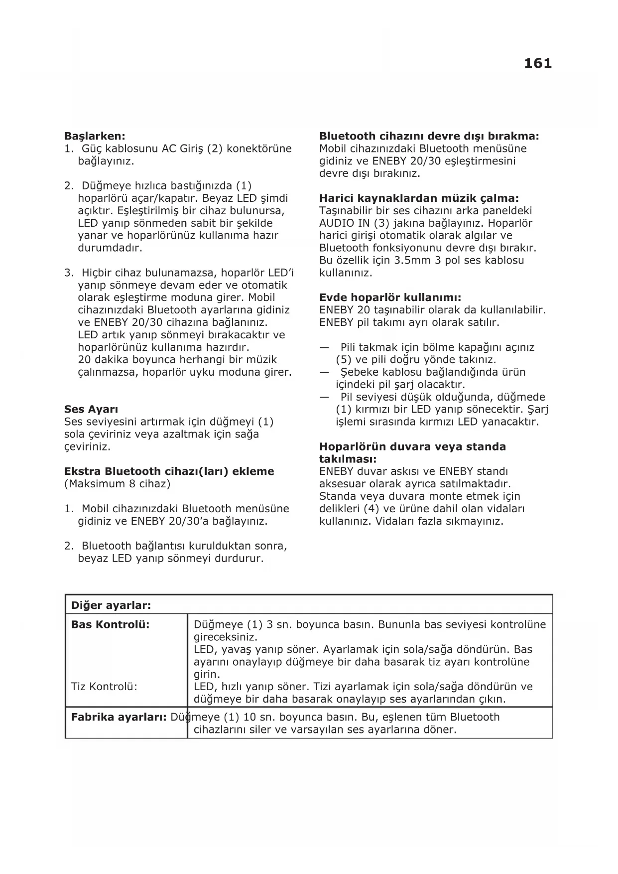 beyaz LED yanıp sönmeyi durdurur. Bluetooth cihazını devre dışı bırakma: Mobil cihazınızdaki Bluetooth menüsüne gidiniz ve ENEBY 20/30 eşleştirmesini devre dışı bırakınız. Harici kaynaklardan müzik çalma: Taşınabilir bir ses cihazını arka paneldeki AUDIO IN (3) jakına bağlayınız. Hoparlör harici girişi otomatik olarak algılar ve Bluetooth fonksiyonunu devre dışı bırakır. Bu özellik için 3.5mm 3 pol ses kablosu kullanınız. Evde hoparlör kullanımı: ENEBY 20 taşınabilir olarak da kullanılabilir. ENEBY pil takımı ayrı olarak satılır. — Pili takmak için bölme kapağını açınız (5) ve pili doğru yönde takınız. — Şebeke kablosu bağlandığında ürün içindeki pil şarj olacaktır. — Pil seviyesi düşük olduğunda, düğmede (1) kırmızı bir LED yanıp sönecektir. Şarj işlemi sırasında kırmızı LED yanacaktır. Hoparlörün duvara veya standa takılması: ENEBY duvar askısı ve ENEBY standı aksesuar olarak ayrıca satılmaktadır. Standa veya duvara monte etmek için delikleri (4) ve ürüne dahil olan vidaları kullanınız. Vidaları fazla sıkmayınız. Diğer ayarlar: Bas Kontrolü: Tiz Kontrolü: Düğmeye (1) 3 sn. boyunca basın. Bununla bas seviyesi kontrolüne gireceksiniz. LED, yavaş yanıp söner. Ayarlamak için sola/sağa döndürün. Bas ayarını onaylayıp düğmeye bir daha basarak tiz ayarı kontrolüne girin. LED, hızlı yanıp söner. Tizi ayarlamak için sola/sağa döndürün ve düğmeye bir daha basarak onaylayıp ses ayarlarından çıkın. Fabrika ayarları: Düğmeye (1) 10 sn. boyunca basın. Bu, eşlenen tüm Bluetooth cihazlarını siler ve varsayılan ses ayarlarına döner.Güvenlik ve önemli bilgiler UYARI: — Aşırı ısınma tehlikesi! Ürünü kesinlikle kapalı bir yere kurmayınız. Havalandırma için daima ürünün çevresinde en az 5 mm boşluk bırakınız. Perdelerin veya diğer nesnelerin ürünün havalandırma deliklerini kesinlikle kapatmadığından emin olunuz. — Ürünü veya pilleri, doğrudan güneş ışığı da dahil olmak üzere açık ateş veya diğer ısı kaynaklarının yakınına yerleştirmeyiniz. — Bu ürünü sadece kapalı mekanlarda kullanınız. Cihaz, damlamaya veya sıçramaya maruz bırakılmamalı, vazo gibi sıvılarla dolu herhangi bir cisim cihaz üzerine yerleştirilmemelidir. — Bu ürünü hiçbir zaman diğer elektrikli cihazların üzerine koymayınız. — Şebeke şi veya cihaz bağlayıcı bir bağlantı kesme cihazı olarak kullanılmalıdır, bağlantı kesme cihazı kolayca kullanılabilir durumda olmalıdır. — Besleme kablosu hasar görürse, ülkeniz için onaylı tip yeni bir kablo setiyle değiştiriniz. — Piller (pil takımı veya piller takılı halde) güneş ışığı, ateş veya benzeri aşırı ısıya maruz bırakılmamalıdır. ÖNEMLİ! — Hoparlör yalnızca iç mekan kullanımı içindir ve 0ºC ile 45ºC arasında değişen sıcaklıklarda kullanılabilir. — Aşırı ısınmasına yol açacağından hoparlörü doğrudan güneş ışığına veya herhangi bir ısı kaynağına yakın bir yerde bırakmayınız. — Hoparlörü ıslak, nemli veya aşırı tozlu ortamlara maruz bırakmayınız, aksi takdirde hasara neden olabilir. — Hoparlör ve alıcı arasındaki mesafe açık havada ölçülür. — Farklı yapı malzemeleri ve ünitelerin yerleştirilmesi, kablosuz bağlantı erişimini etkileyebilir. — Çok fazla ses işitme duyunuza zarar verebilir. — Akustik bileşenlere dokunmayınız. — Ürünü raf veya stand olarak kullanmayınız.