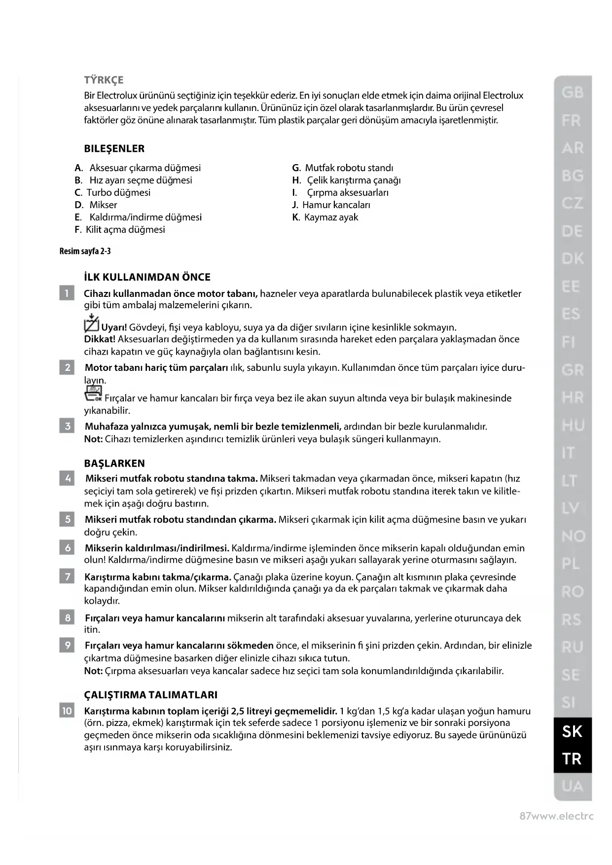 Çalıştırma sırasında motor yavaşlıyor. Hamur miktarı maksimum kapasiteyi aşmış olabilir. Yarısını çıkarın ve işlemi iki defada gerçekleştirin. Hamur fazla sulu olabilir, kabın yüzeyine yapışıyor. Motorun hızı artıncaya kadar her defasında 1 kaşık olmak üzere biraz daha un ekleyin. Kabın yüzeyindeki hamur temizlenene kadar işlemi sürdürün. Motor çalışmıyor. Cihaz prize takılı değildir. İşleme başlamadan önce cihazın prize takıldığından emin olun. Cihaz işlem sırasında titriyor/ hareket ediyor. Lastik ayaklar ıslaktır. Ünitenin altındaki lastik ayakların temiz ve kuru olduğundan emin olun. Hız seçicide çok yüksek ayar. Hız ayarını düşürün. Ağır yükler için bu durum normaldir (örneğin ağır hamurlar, peynir). Yarısını çıkarın ve işlemi iki defada gerçekleştirin. Cihaz hala çalışmıyorsa, müşteri hizmetleri ile temasa geçin.90www.electrolux.com ELDEN ÇIKARMA Üründeki bu sembol, bu ürünün normal ev atıklarıyla birlikte atılmaması gereken bir batarya içerdiğini belirtir. Cihazın veya cihazla birlikte verilen belgelerin üzerindeki bu sembol, ürüne evsel atık muamelesi yapılmaması gerektiğini belirtir. Ürününüzü geri dönüştürmek için lütfen resmi bir toplama noktasına veya batarya ve elektrikli parçaları güvenli ve profesyonel bir şekilde sökebilecek ve geri dönüştürebilecek bir Electrolux servis merkezine götürün. Elektrikli ürünlerin ve şarj edilebilir bataryaların ayrı toplanması için ülkenizin kurallarına uyun. Electrolux bildirimde bulunmadan ürünleri, bilgileri ve teknik özellikleri değiştirme hakkını saklı tutar.
