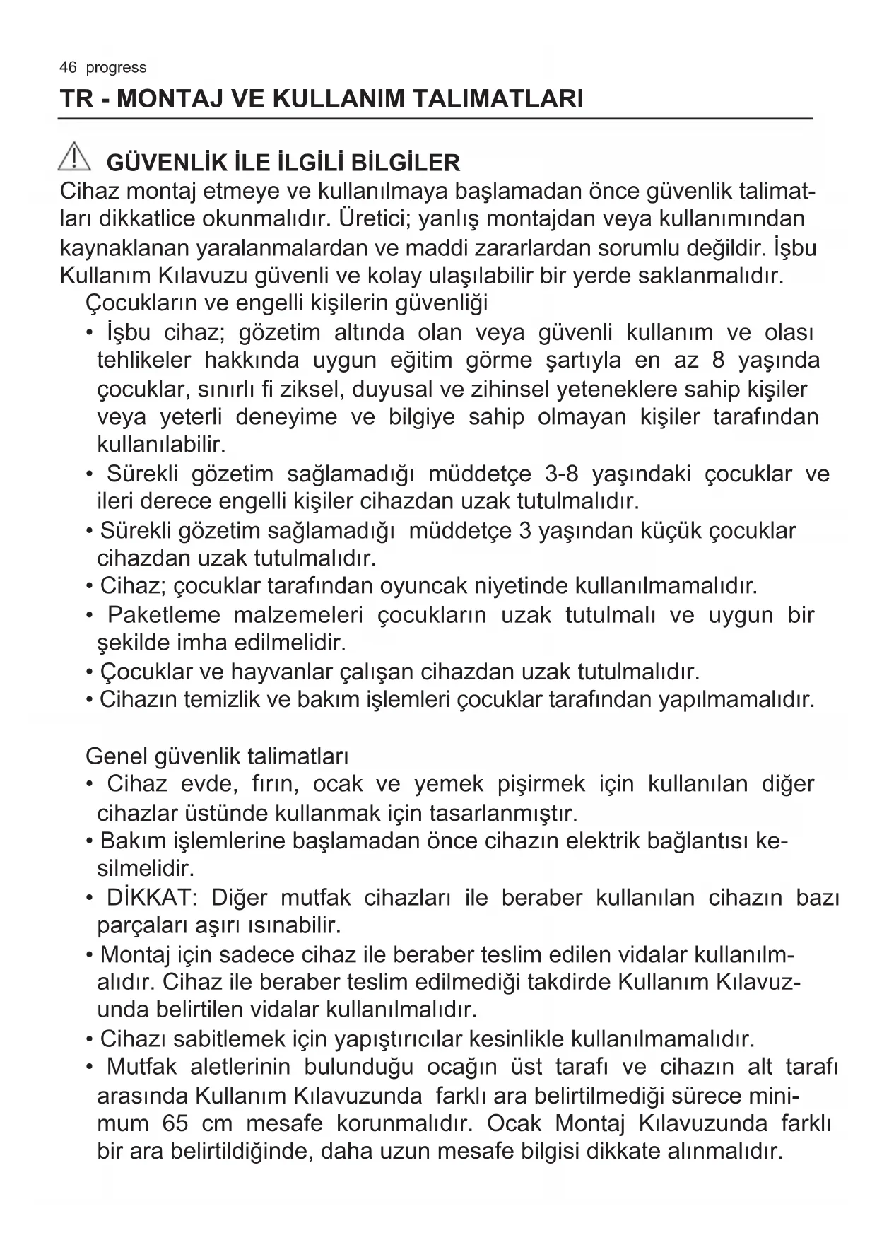 - Mutfak aletlerinin bulunduğu ocağın üst tarafı ve cihazın alt tarafı arasında Kullanım Kılavuzunda farklı ara belirtilmediği sürece mini- mum 65 cm mesafe korunmalıdır. Ocak Montaj Kılavuzunda farklı bir ara belirtildiğinde, daha uzun mesafe bilgisi dikkate alınmalıdır.progress 47