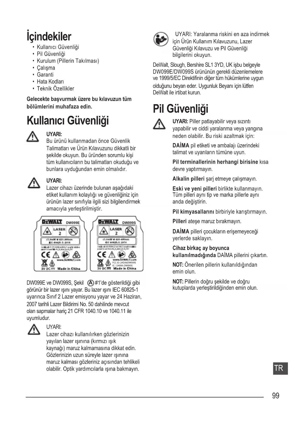 #1'de gösterildiği gibi görünür bir lazer ışını yayar. Bu lazer ışını IEC 60825-1 uyarınca Sınıf 2 Lazer emisyonu yayar ve 24 Haziran, 2007 tarihli Lazer Bildirimi No. 50 dahilinde mevcut olan sapmalar hariç 21 CFR 1040.10 ve 1040.11 ile uyumludur. UYARI: Lazer cihazı kullanılırken gözlerinizin yayılan lazer ışınına (kırmızı ışık kaynağı) maruz kalmamasına dikkat edin. Gözlerinizin uzun süreyle lazer ışınına maruz kalması gözleriniz açısından tehlikeli olabilir. Optik yardımcılarla ışına bakmayın. UYARI: Yaralanma riskini en aza indirmek için Ürün Kullanım Kılavuzunu, Lazer Güvenliği Kılavuzu ve Pil Güvenliği bilgilerini okuyun. DeWalt, Slough, Bershire SL1 3YD, UK işbu belgeyle DW099E/DW099S ürününün gerekli düzenlemelere ve 1999/5/EC Direktinin diğer tüm hükümlerine uygun olduğunu beyan eder. Uygunluk Beyanı için lütfen DeWalt ile irtibat kurun. Pil Güvenliği UYARI: Piller patlayabilir veya sızıntı yapabilir ve ciddi yaralanma veya yangına neden olabilir. Bu riski azaltmak için: DAİMA pil etiketi ve ambalajı üzerindeki talimat ve uyarıların tümüne uyun. Pil terminallerinin herhangi birisine kısa devre yaptırmayın. Alkalin pilleri şarj etmeye çalışmayın. Eski ve yeni pilleri birlikte kullanmayın. Tüm pilleri aynı tip ve marka pillerle aynı anda değiştirin. Pil kimyasallarını birbiriyle karıştırmayın. Pilleri ateşe maruz bırakmayın. DAİMA pilleri çocukların erişemeyeceği yerlerde saklayın. Cihaz birkaç ay boyunca kullanılmadığında DAİMA pillerini çıkartın. NOT: Önerilen pillerin kullanıldığından emin olun. NOT: Pillerin doğru şekilde ve doğru kutuplarda yerleştirildiğinden emin olun.100