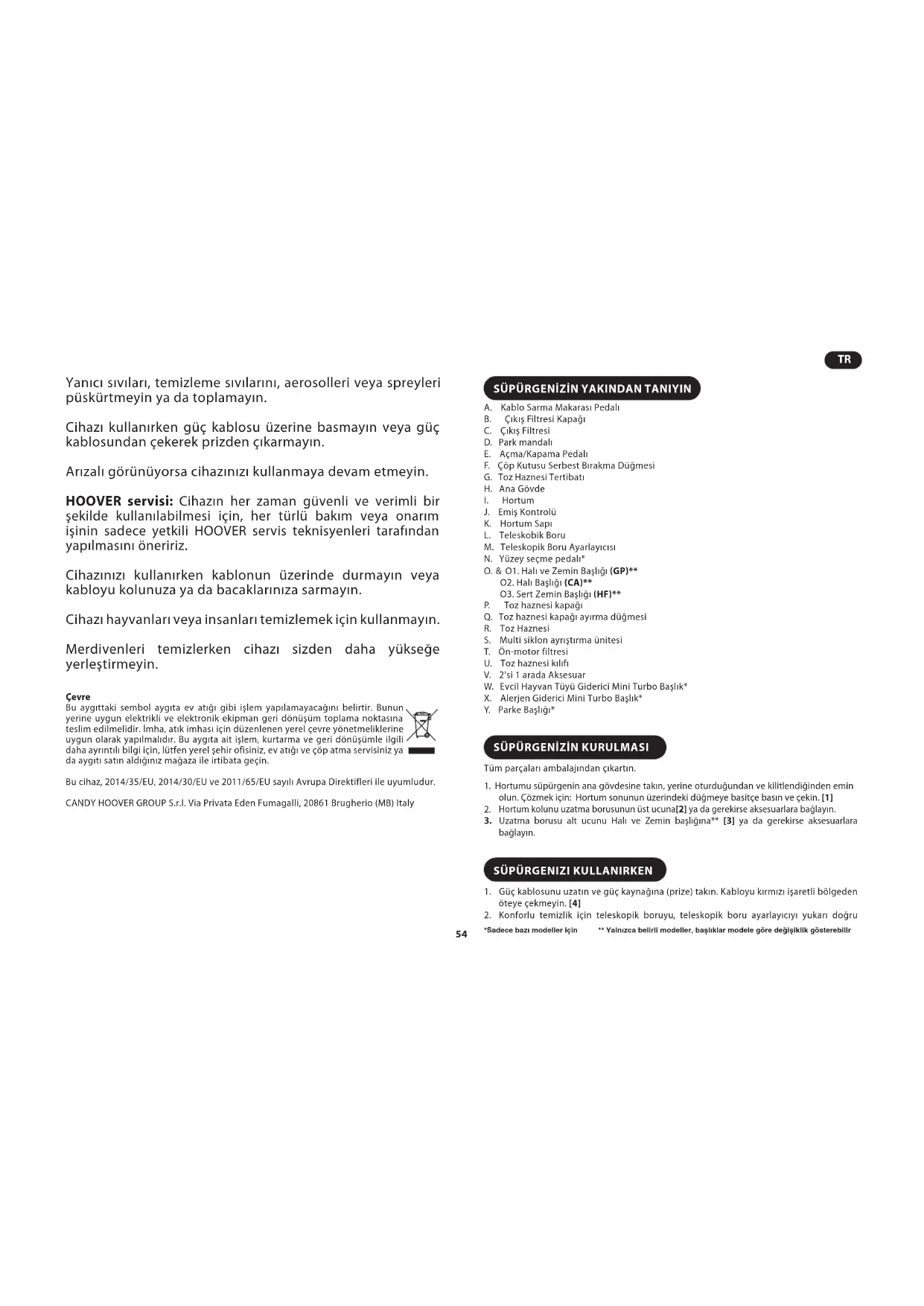 - Nie je vysávač prehriaty? Ak áno, automatický reset potrvá približne 30 minút. TRYanıcı sıvıları, temizleme sıvılarını, aerosolleri veya spreyleri püskürtmeyin ya da toplamayın. Cihazı kullanırken güç kablosu üzerine basmayın veya güç kablosundan çekerek prizden çıkarmayın. Arızalı görünüyorsa cihazınızı kullanmaya devam etmeyin. HOOVER servisi: Cihazın her zaman güvenli ve verimli bir şekilde kullanılabilmesi için, her türlü bakım veya onarım işinin sadece yetkili HOOVER servis teknisyenleri tarafından yapılmasını öneririz. Cihazınızı kullanırken kablonun üzerinde durmayın veya kabloyu kolunuza ya da bacaklarınıza sarmayın. Cihazı hayvanları veya insanları temizlemek için kullanmayın. Merdivenleri temizlerken cihazı sizden daha yükseğe yerleştirmeyin. Çevre Bu aygıttaki sembol aygıta ev atığı gibi işlem yapılamayacağını belirtir. Bunun yerine uygun elektrikli ve elektronik ekipman geri dönüşüm toplama noktasına teslim edilmelidir. İmha, atık imhası için düzenlenen yerel çevre yönetmeliklerine uygun olarak yapılmalıdır. Bu aygıta ait işlem, kurtarma ve geri dönüşümle ilgili daha ayrıntılı bilgi için, lütfen yerel şehir ofisiniz, ev atığı ve çöp atma servisiniz ya da aygıtı satın aldığınız mağaza ile irtibata geçin. Bu cihaz, 2014/35/EU, 2014/30/EU ve 2011/65/EU sayılı Avrupa Direktifleri ile uyumludur. CANDY HOOVER GROUP S.r.l. Via Privata Eden Fumagalli, 20861 Brugherio (MB) Italy SÜPÜRGENİZİN YAKINDAN TANIYIN