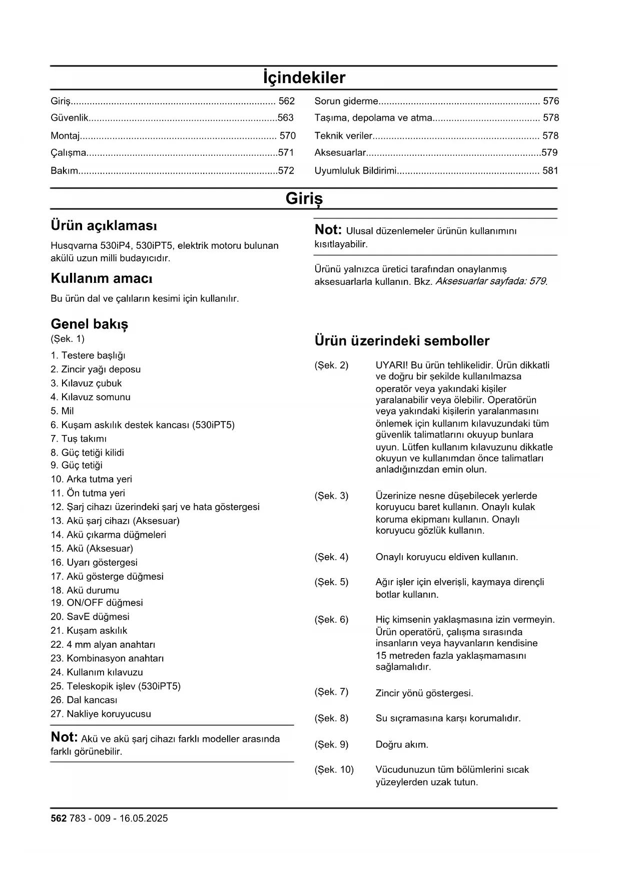 - Uyumluluk Bildirimi Giriş Ürün açıklaması Husqvarna 530iP4, 530iPT5, elektrik motoru bulunan akülü uzun milli budayıcıdır. Kullanım amacı Bu ürün dal ve çalıların kesimi için kullanılır. Not: Ulusal düzenlemeler ürünün kullanımını kısıtlayabilir. Ürünü yalnızca üretici tarafından onaylanmış aksesuarlarla kullanın. Bkz. Aksesuarlar sayfada: 579 p. 581