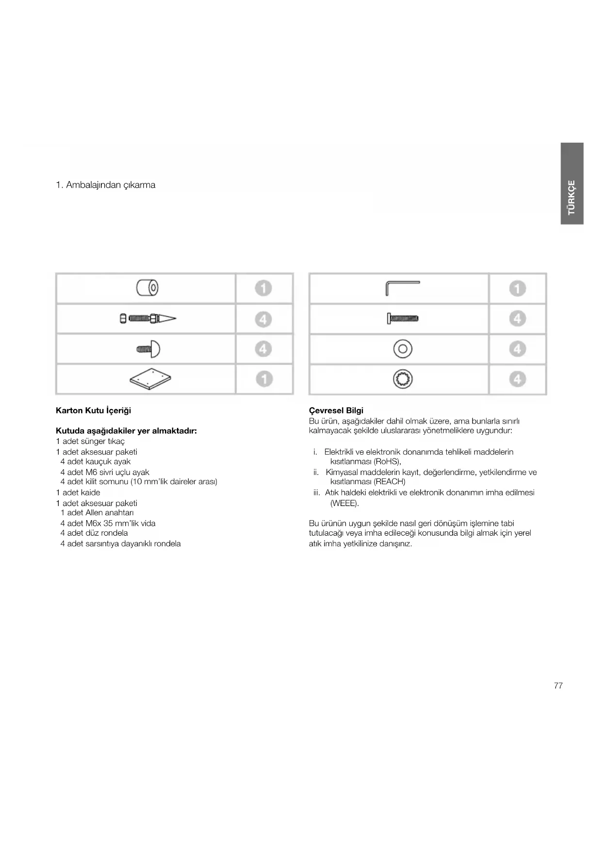 Karton Kutu İçeriği Kutuda aşağıdakiler yer almaktadır: 1 adet sünger tıkaç 1 adet aksesuar paketi 4 adet kauçuk ayak 4 adet M6 sivri uçlu ayak 4 adet kilit somunu (10 mm’lik daireler arası) 1 adet kaide 1 adet aksesuar paketi 1 adet Allen anahtarı 4 adet M6x 35 mm’lik vida 4 adet düz rondela 4 adet sarsıntıya dayanıklı rondela Çevresel Bilgi Bu ürün, aşağıdakiler dahil olmak üzere, ama bunlarla sınırlı kalmayacak şekilde uluslararası yönetmeliklere uygundur: