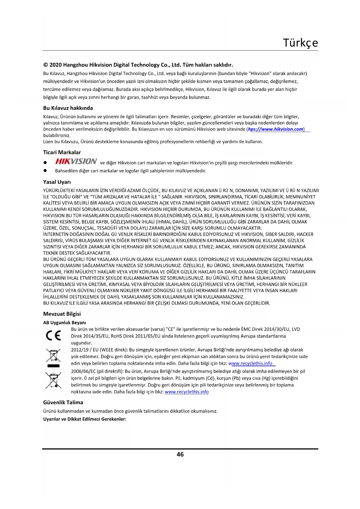 © 2020 Hangzhou Hikvision Digital Technology Co., Ltd. Tüm hakları saklıdır. Bu Kılavuz, Hangzhou Hikvision Digital Technology Co., Ltd. veya bağlı kuruluşlarının (bundan böyle "Hikvision" olarak anılacaktır) mülkiyetindedir ve Hikvision'un önceden yazılı izni olmaksızın hiçbir şekilde kısmen veya tamamen çoğaltılamaz, değiştirilemez, tercüme edilemez veya dağıtılamaz. Burada aksi açıkça belirtilmedikçe, Hikvision, Kılavuz ile ilgili olarak burada yer alan hiçbir bilgiyle ilgili açık veya zımni herhangi bir garanti, taahhüt veya beyanda bulunmaz. Bu Kılavuz hakkında Kılavuz, Ürünün kullanımı ve yönetimi ile ilgili talimatları içerir. Resimler, çizelgeler, görüntüler ve buradaki diğer tüm bilgiler, yalnızca tanımlama ve açıklama amaçlıdır. Kılavuzda bulunan bilgiler, yazılım güncellemeleri veya başka nedenlerden dolayı önceden haber verilmeksizin değiştirilebilir. Bu Kılavuzun en son sürümünü Hikvision web sitesinde (https://www.h ikvision.com) bulabilirsiniz. Lütfen bu Kılavuzu, Ürünü destekleme konusunda eğitilmiş profesyonellerin rehberliği ve yardımı ile kullanın. Ticari Markalar ve diğer Hikvision ticari markaları ve logoları Hikvision'ın çeşitli yargı mercilerindeki mülkleridir. Bahsedilen diğer ticari markalar ve logolar ilgili sahiplerinin mülkiyetindedir. Yasal Uyarı YÜRÜRLÜKTEKİ YASALARIN İZİN VERDİĞİ AZAMİ ÖLÇÜDE, BU KILAVUZ VE AÇIKLANAN ÜRÜ N, DONANIMI, YAZILIMI VE ÜRÜ N YAZILIMI İLE “OLDUĞU GİBİ” VE “TÜM ARIZALAR VE HATALAR İLE " SAĞLANIR. HIKVISION, SINIRLANDIRMA, TİCARİ OLABİLİRLİK, MEMNUNİYET KALİTESİ VEYA BELİRLİ BİR AMACA UYGUN OLMAKSIZIN AÇIK VEYA ZIMNİ HİÇBİR GARANTİ VERMEZ. ÜRÜNÜN SİZİN TARAFINIZDAN KULLANIMI KENDİ SORUMLULUĞUNUZDADIR. HIKVISION HİÇBİR DURUMDA, BU ÜRÜNÜN KULLANIMI İLE BAĞLANTILI OLARAK, HIKVISION BU TÜR HASARLARIN OLASILIĞI HAKKINDA BİLGİLENDİRİLMİŞ OLSA BİLE, İŞ KARLARININ KAYBI, İŞ KESİNTİSİ, VERİ KAYBI, SİSTEM KESİNTİSİ, BELGE KAYBI, SÖZLEŞMENİN İHLALİ (İHMAL DAHİL), ÜRÜN SORUMLULUĞU GİBİ ZARARLAR DA DAHİL OLMAK ÜZERE, ÖZEL, SONUÇSAL, TESADÜFİ VEYA DOLAYLI ZARARLAR İÇİN SİZE KARŞI SORUMLU OLMAYACAKTIR. İNTERNETİN DOĞASININ DOĞAL GÜ VENLİK RİSKLERİ BARINDIRDIĞINI KABUL EDİYORSUNUZ VE HIKVISION, SİBER SALDIRI, HACKER SALDIRISI, VİRÜS BULAŞMASI VEYA DİĞER İNTERNET GÜ VENLİK RİSKLERİNDEN KAYNAKLANAN ANORMAL KULLANIM, GİZLİLİK SIZINTISI VEYA DİĞER ZARARLAR İÇİN HERHANGİ BİR SORUMLULUK KABUL ETMEZ; ANCAK, HIKVISION GEREKİRSE ZAMANINDA TEKNİK DESTEK SAĞLAYACAKTIR. BU ÜRÜNÜ GEÇERLİ TÜM YASALARA UYGUN OLARAK KULLANMAYI KABUL EDİYORSUNUZ VE KULLANIMINIZIN GEÇERLİ YASALARA UYGUN OLMASINI SAĞLAMAKTAN YALNIZCA SİZ SORUMLUSUNUZ. ÖZELLİKLE, BU ÜRÜNÜ, SINIRLAMA OLMAKSIZIN, TANITIM HAKLARI, FİKRİ MÜLKİYET HAKLARI VEYA VERİ KORUMA VE DİĞER GİZLİLİK HAKLARI DA DAHİL OLMAK ÜZERE ÜÇÜNCÜ TARAFLARIN HAKLARINI İHLAL ETMEYECEK ŞEKİLDE KULLANMAKTAN SİZ SORUMLUSUNUZ. BU ÜRÜNÜ, KİTLE İMHA SİLAHLARININ GELİŞTİRİLMESİ VEYA ÜRETİMİ, KİMYASAL VEYA BİYOLOJİK SİLAHLARIN GELİŞTİRİLMESİ VEYA ÜRETİMİ, HERHANGİ BİR NÜKLEER PATLAYICI VEYA GÜVENLİ OLMAYAN NÜKLEER YAKIT DÖNGÜSÜ İLE İLGİLİ HERHANGİ BİR FAALİYETTE VEYA İNSAN HAKLARI İHLALLERİNİ DESTEKLEMEK DE DAHİL YASAKLANMIŞ SON KULLANIMLAR İÇİN KULLANAMAZSINIZ. BU KILAVUZ İLE İLGİLİ YASA ARASINDA HERHANGİ BİR ÇELİŞKİ OLMASI DURUMUNDA, YENİ OLAN GEÇERLİDİR. Mevzuat Bilgisi AB Uygunluk Beyanı