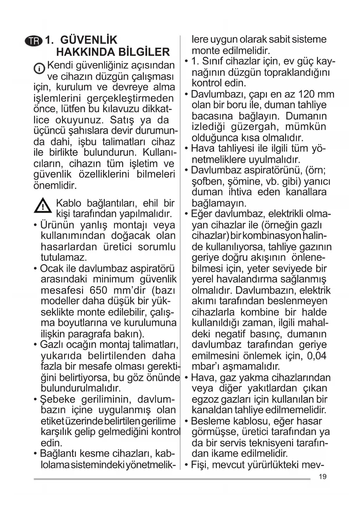 - Davlumbaz aspiratörünü, (örn; şofben, şömine, vb. gibi) yanıcı duman ihtiva eden kanallara bağlamayın.