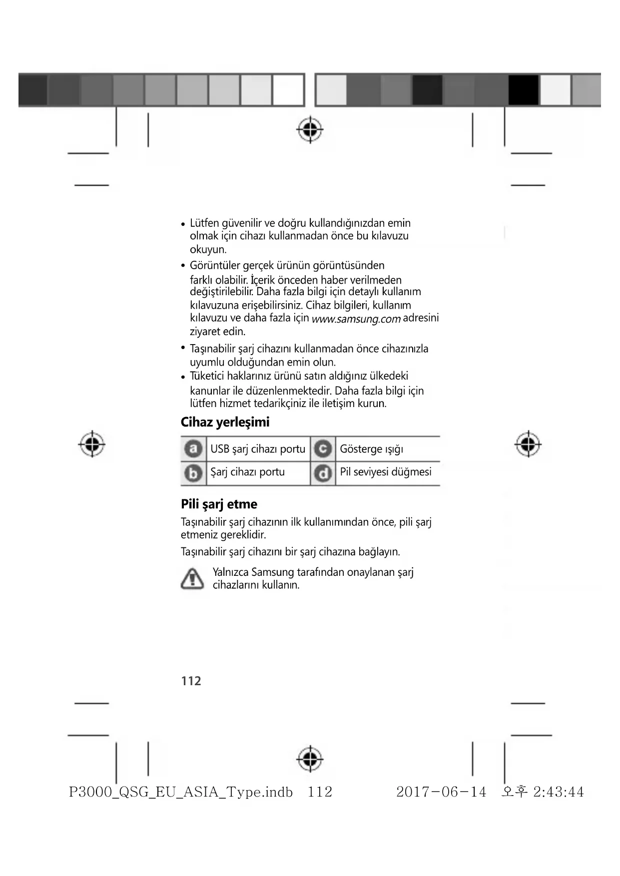 Tüketici haklarınız ürünü satın aldığınız ülkedeki kanunlar ile düzenlenmektedir. Daha fazla bilgi için lütfen hizmet tedarikçiniz ile iletişim kurun. Cihaz yerleşimi USB şarj cihazı portu Gösterge ışığı Şarj cihazı portu Pil seviyesi düğmesi Pili şarj etme Ta şınabilir şarj cihazının ilk kullanımından önce, pili şarj etmeniz gereklidir. Ta şınabilir şarj cihazını bir şarj cihazına bağlayın. Yalnızca Samsung tarafından onaylanan şarj cihazlarını kullanın. Türkçe P3000_QSG_EU_ASIA_Type.indb 112P3000_QSG_EU_ASIA_Type.indb 112 2017-06-14 오후 2:43:442017-06-14 오후 2:43:44113 Türkçe