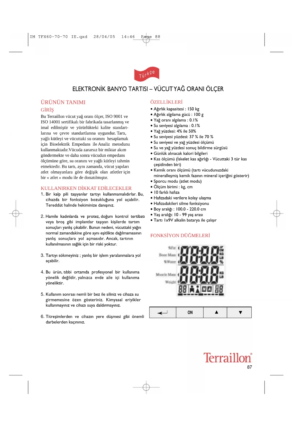 GİRİŞ Bu Terraillon vücut yağ oranı ölçer, ISO 9001 ve ISO 14001 sertifikalı bir fabrikada tasarlanmış ve imal edilmiştir ve yürürlükteki kalite standart- larına ve çevre standartlarına uygundur. Tartı, yağlı kütleyi ve vücuttaki su oranını hesaplamak için Bioelektrik Empedans ile Analiz metodunu kullanmaktadır.Vücuda zararsız bir miktar akım göndermekte ve daha sonra vücudun empedans ölçümüne göre, su oranını ve yağlı kütleyi tahmin etmektedir. Bu tartı, aynı zamanda, vücut yapıları atlet olmayanlara göre değişik olan atletler için bir « atlet » modu ile de donatılmıştır.