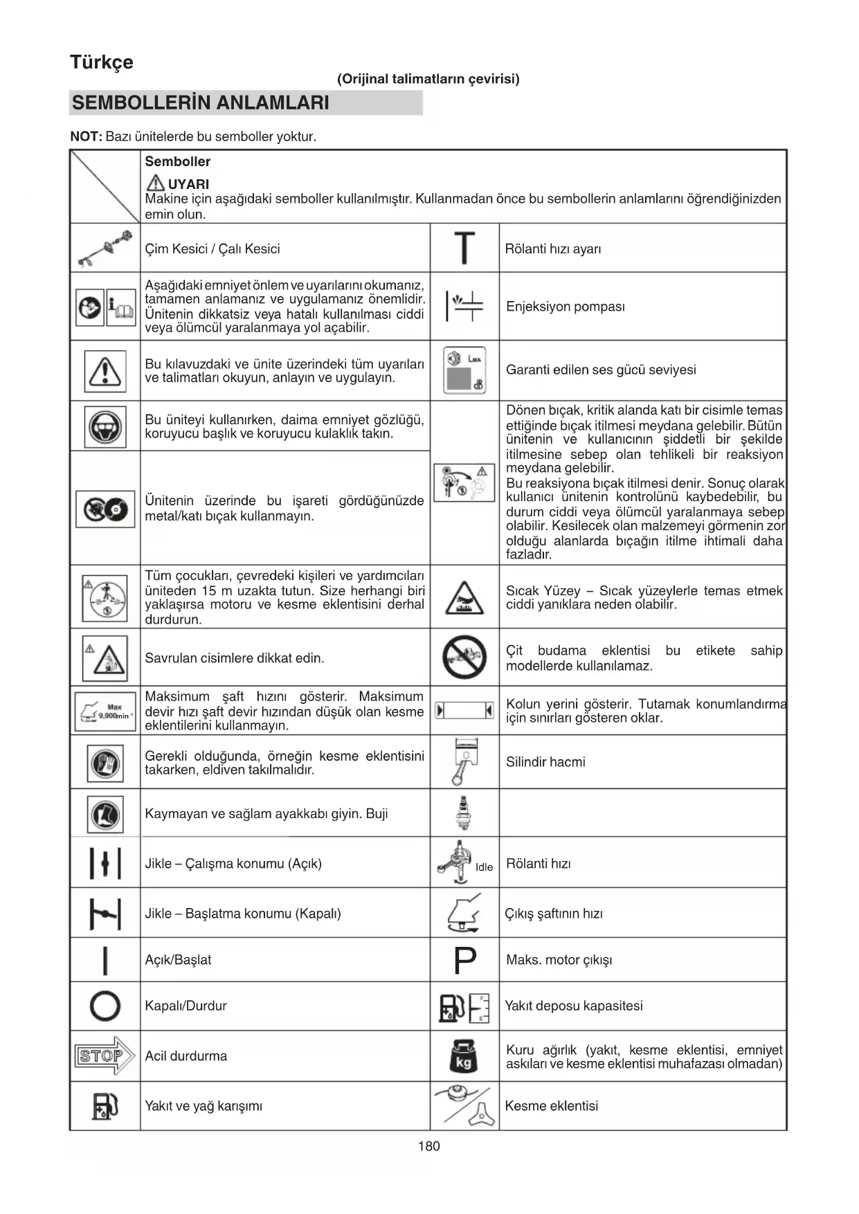 NOT: Bazı ünitelerde bu semboller yoktur. Semboller UYARI Makine için aşağıdaki semboller kullanılmıştır. Kullanmadan önce bu sembollerin anlamlarını öğrendiğinizden emin olun. Çim Kesici / Çalı Kesici Rölanti hızı ayarı Aşağıdaki emniyet önlem ve uyarılarını okumanız, tamamen anlamanız ve uygulamanız önemlidir. Ünitenin dikkatsiz veya hatalı kullanılması ciddi veya ölümcül yaralanmaya yol açabilir. Enjeksiyon pompası Bu kılavuzdaki ve ünite üzerindeki tüm uyarıları ve talimatları okuyun, anlayın ve uygulayın. Garanti edilen ses gücü seviyesi Bu üniteyi kullanırken, daima emniyet gözlüğü, koruyucu başlık ve koruyucu kulaklık takın. Dönen bıçak, kritik alanda katı bir cisimle temas ettiğinde bıçak itilmesi meydana gelebilir. Bütün ünitenin ve kullanıcının şiddetli bir şekilde itilmesine sebep olan tehlikeli bir reaksiyon meydana gelebilir. Bu reaksiyona bıçak itilmesi denir. Sonuç olarak kullanıcı ünitenin kontrolünü kaybedebilir, bu durum ciddi veya ölümcül yaralanmaya sebep olabilir. Kesilecek olan malzemeyi görmenin zor olduğu alanlarda bıçağın itilme ihtimali daha fazladır. Ünitenin üzerinde bu işareti gördüğünüzde metal/katı bıçak kullanmayın. Tüm çocukları, çevredeki kişileri ve yardımcıları üniteden 15 m uzakta tutun. Size herhangi biri yaklaşırsa motoru ve kesme eklentisini derhal durdurun. Sıcak Yüzey – Sıcak yüzeylerle temas etmek ciddi yanıklara neden olabilir. Savrulan cisimlere dikkat edin. Çit budama eklentisi bu etikete sahip modellerde kullanılamaz. min