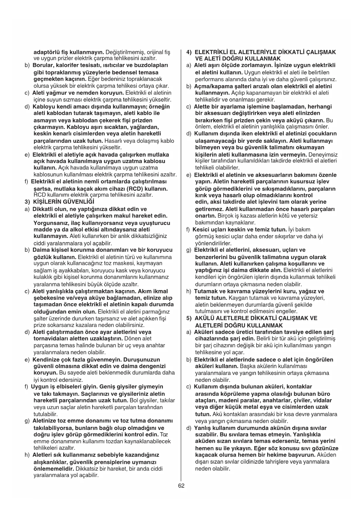 a) Dikkatli olun, ne yaptığınıza dikkat edin ve elektrikli el aletiyle çalışırken makul hareket edin. Yorgunsanız, ilaç kullanıyorsanız veya uyuşturucu madde ya da alkol etkisi altındaysanız aleti kullanmayın. Aleti kullanırken bir anlık dikkatsizliğiniz ciddi yaralanmalara yol açabilir. b) Daima kişisel korunma donanımları ve bir koruyucu gözlük kullanın. Elektrikli el aletinin türü ve kullanımına uygun olarak kullanacağınız toz maskesi, kaymayan sağlam iş ayakkabıları, koruyucu kask veya koruyucu kulaklık gibi kişisel korunma donanımlarını kullanmanız yaralanma tehlikesini büyük ölçüde azaltır. c) Aleti yanlışlıkla çalıştırmaktan kaçının. Akım ikmal şebekesine ve/veya aküye bağlamadan, elinize alıp taşımadan önce elektrikli el aletinin kapalı durumda olduğundan emin olun. Elektrikli el aletini parmağınız şalter üzerinde dururken taşırsanız ve alet açıkken şi prize sokarsanız kazalara neden olabilirsiniz. d) Aleti çalıştırmadan önce ayar aletlerini veya tornavidaları aletten uzaklaştırın. Dönen alet parçasına temas halinde bulunan bir uç veya anahtar yaralanmalara neden olabilir. e) Kendinize çok fazla güvenmeyin. Duruşunuzun güvenli olmasına dikkat edin ve daima dengenizi koruyun. Bu sayede aleti beklenmedik durumlarda daha iyi kontrol edersiniz. f) Uygun iş elbiseleri giyin. Geniş giysiler giymeyin ve takı takmayın. Saçlarınızı ve giysileriniz aletin hareketli parçalarından uzak tutun. Bol giysiler, takılar veya uzun saçlar aletin hareketli parçaları tarafından tutulabilir. g) Aletinize toz emme donanımı ve toz tutma donanımı takılabiliyorsa, bunların bağlı olup olmadığını ve doğru işlev görüp görmediklerini kontrol edin. Toz emme donanımının kullanımı tozdan kaynaklanabilecek tehlikeleri azaltır. h) Aletleri sık kullanmanız sebebiyle kazandığınız alışkanlıklar, güvenlik prensiplerine uymanızı önlememelidir. Dikkatsiz bir hareket, bir anda ciddi yaralanmalara yol açabilir.63