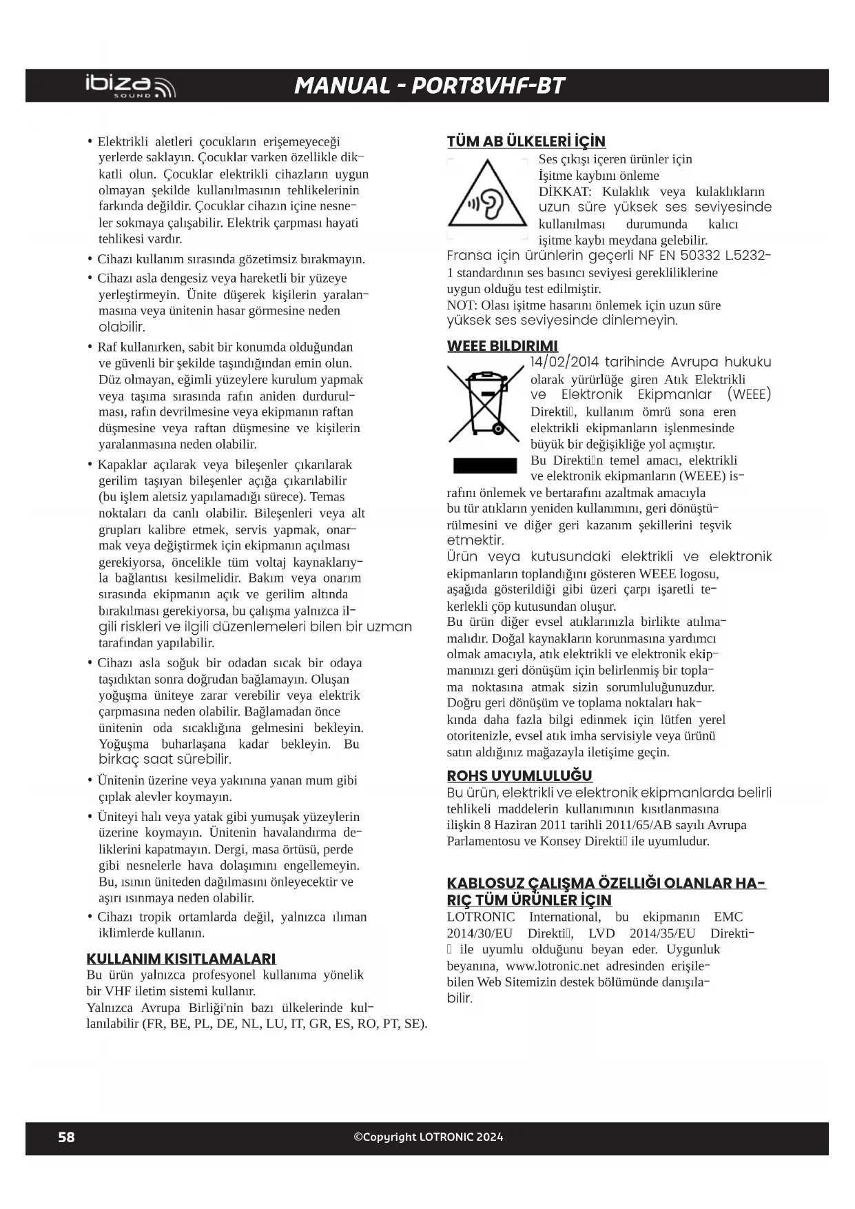 - Cihazı tropik ortamlarda değil, yalnızca ılıman iklimlerde kullanın. KULLANIM KISITLAMALARI Bu ürün yalnızca profesyonel kullanıma yönelik bir VHF iletim sistemi kullanır. Yalnızca Avrupa Birliği'nin bazı ülkelerinde kul- lanılabilir (FR, BE, PL, DE, NL, LU, IT, GR, ES, RO, PT, SE).