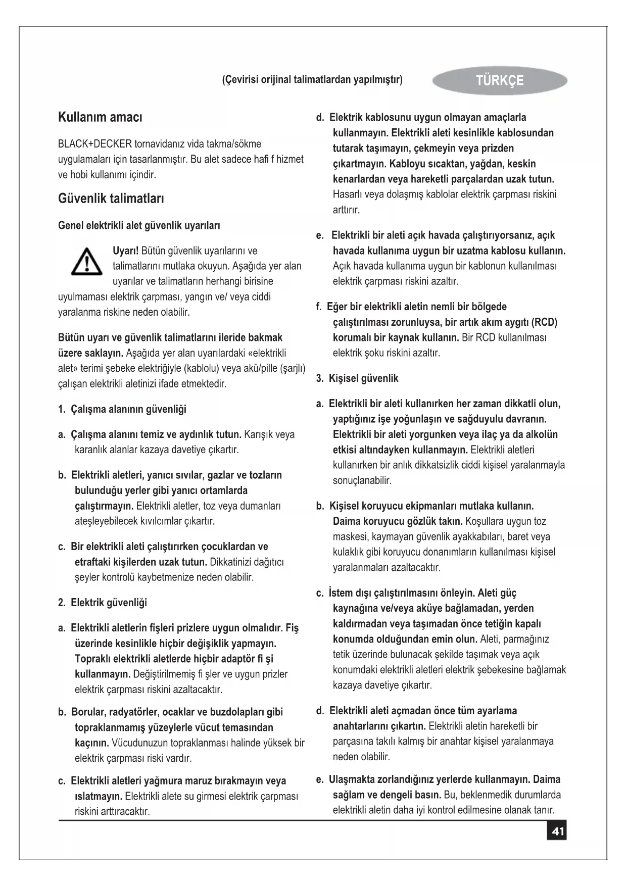 (Çevirisi orijinal talimatlardan yapılmıştır) Kullanım amacı BLACK+DECKER tornavidanız vida takma/sökme uygulamaları için tasarlanmıştır. Bu alet sadece hafi f hizmet ve hobi kullanımı içindir. Güvenlik talimatları Genel elektrikli alet güvenlik uyarıları Uyarı! Bütün güvenlik uyarılarını ve talimatlarını mutlaka okuyun. Aşağıda yer alan uyarılar ve talimatların herhangi birisine uyulmaması elektrik çarpması, yangın ve/ veya ciddi yaralanma riskine neden olabilir. Bütün uyarı ve güvenlik talimatlarını ileride bakmak üzere saklayın. Aşağıda yer alan uyarılardaki «elektrikli alet» terimi şebeke elektriğiyle (kablolu) veya akü/pille (şarjlı) çalışan elektrikli aletinizi ifade etmektedir.