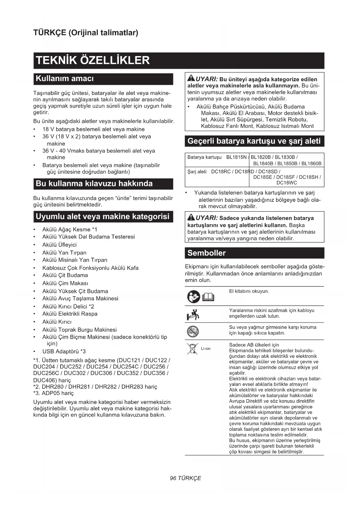 DUC406)hariç *2.DHR280/DHR281/DHR282/DHR283hariç *3.ADP05hariç Uyumlualetveyamakinekategorisihabervermeksizin değiştirilebilir.Uyumlualetveyamakinekategorisihak- kındabilgiiçinengüncelkullanmakılavuzunabakın. UYARI: Bu üniteyi aşağıda kategorize edilen aletler veya makinelerle asla kullanmayın.Buüni- teninuyumsuzaletlerveyamakinelerlekullanılması yaralanmayadaarızayanedenolabilir.
