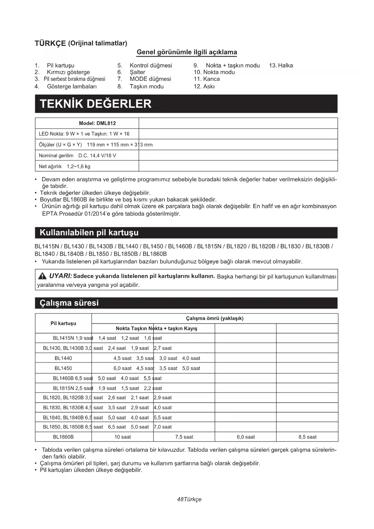 - Yukarıdalistelenenpilkartuşlarındanbazılarıbulunduğunuzbölgeyebağlıolarakmevcutolmayabilir. UYARI: Sadece yukarıda listelenen pil kartuşlarını kullanın. Başkaherhangibirpilkartuşununkullanılması yaralanmave/veyayangınayolaçabilir. Çalışma süresi Pil kartuşuÇalışma ömrü (yaklaşık)Nokta Taşkın Nokta + taşkın KayışBL1415N 1,9saat 1,4saat 1,2saat 1,6saatBL1430, BL1430B 3,0saat 2,4saat 1,9saat 2,7saatBL1440 4,5saat 3,5saat 3,0saat 4,0saatBL1450 6,0saat 4,5saat 3,5saat 5,0saatBL1460B 6,5saat 5,0saat 4,0saat 5,5saatBL1815N 2,5saat 1,9saat 1,5saat 2,2saatBL1820, BL1820B 3,0saat 2,6saat 2,1saat 2,9saatBL1830, BL1830B 4,5saat 3,5saat 2,9saat 4,0saatBL1840, BL1840B 6,5saat 5,0saat 4,0saat 5,5saatBL1850, BL1850B 8,5saat 6,5saat 5,0saat 7,0saat BL1860B 10saat 7,5saat 6,0saat 8,5saat