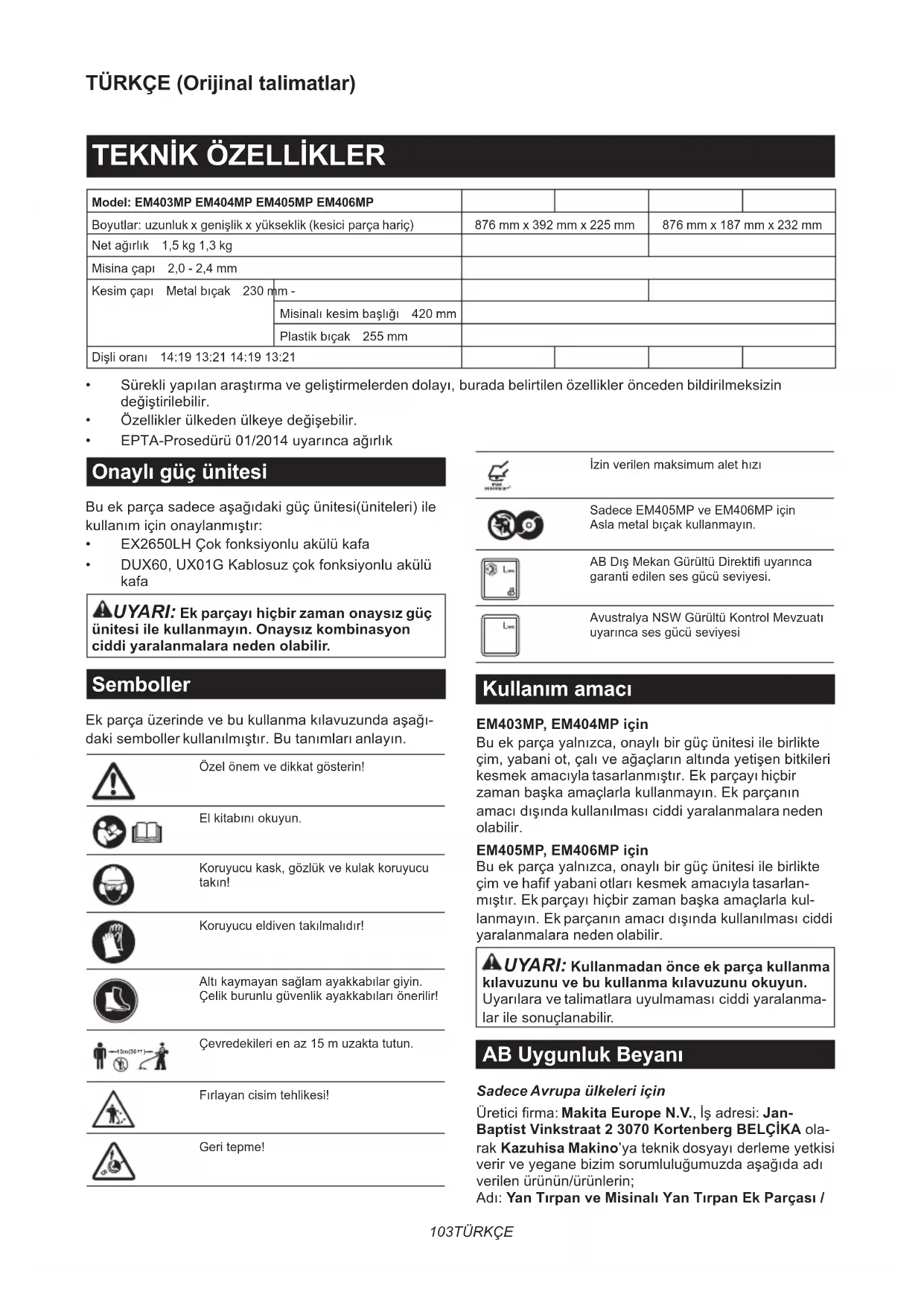 Çevredekilerienaz15muzaktatutun. Fırlayancisimtehlikesi! Geritepme! İzinverilenmaksimumalethızı SadeceEM405MPveEM406MPiçin Aslametalbıçakkullanmayın. ABDışMekanGürültüDirektifiuyarınca garantiedilensesgücüseviyesi. AvustralyaNSWGürültüKontrolMevzuatı uyarıncasesgücüseviyesi Kullanım amacı EM403MP, EM404MP için Buekparçayalnızca,onaylıbirgüçünitesiilebirlikte çim,yabaniot,çalıveağaçlarınaltındayetişenbitkileri kesmekamacıylatasarlanmıştır.Ekparçayıhiçbir zamanbaşkaamaçlarlakullanmayın.Ekparçanın amacıdışındakullanılmasıciddiyaralanmalaraneden olabilir. EM405MP, EM406MP için Buekparçayalnızca,onaylıbirgüçünitesiilebirlikte çimvehafifyabaniotlarıkesmekamacıylatasarlan- mıştır.Ekparçayıhiçbirzamanbaşkaamaçlarlakul- lanmayın.Ekparçanınamacıdışındakullanılmasıciddi yaralanmalaranedenolabilir. UYARI: Kullanmadan önce ek parça kullanma kılavuzunu ve bu kullanma kılavuzunu okuyun. Uyarılaravetalimatlarauyulmamasıciddiyaralanma- larilesonuçlanabilir. AB Uygunluk Beyanı Sadece Avrupa ülkeleri için Üreticifirma:Makita Europe N.V.,İşadresi:Jan- Baptist Vinkstraat 2 3070 Kortenberg BELÇİKA ola- rak Kazuhisa Makino’yateknikdosyayıderlemeyetkisi verirveyeganebizimsorumluluğumuzdaaşağıdaadı verilenürünün/ürünlerin; Adı:Yan Tırpan ve Misinalı Yan Tırpan Ek Parçası /104 TÜRKÇE Misinalı Yan Tırpan Ek Parçası.TipAdı:EM404MP / EM406MP. 2006/42/EC’ninilgilitümhükümlerinikarşıladığınıve ayrıcaaşağıdakiEC/EUDirektierinin:2000/14/ECilgili hükümlerinikarşıladığınıveaşağıdakiUyumluHale GetirilmişStandartlarauygunolarakimaledildiğini beyanederiz:EN 60335-1:2012+A11:2014+A13:2017+ A1:2019+A14:2019+A2:2019+A15:2021 (EM406MP), EN 62841-1:2015+A11:2022 (EM404MP), EN 50636-2-91:2014 (EM406MP), EN ISO 11806-1:2022 (EM404MP) . Beyanyerivetarihi:Kortenberg, Belçika. 1. 8. 2024 Sorumlukişi:Kazuhisa Makino, Direktör - Makita Europe N.V.
