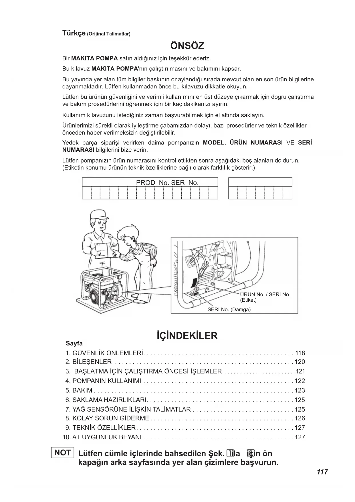 Εμπορική ονομασία Μετρούμενη στάθμη ηχητικής ισχύος Εγγυημένη στάθμη ηχητικής ισχύος EW2050H 100 dB(A) 101 dB(A) EW3050H 103 dB(A) 103 dB(A) EW2051H 101 dB(A) 103 dB(A) EW3051H 104 dB(A) 105 dB(A) Τα εν λόγω επίπεδα θορύβου δεν υποδεικνύουν αναγκαστικά μια συγκεκριμένη στάθμη ασφαλούς εργασίας. Ωστόσο, ο χρήστης μπορεί να προβεί σε καλύτερη αξιολόγηση των κινδύνων και των απειλητικών ενδεχόμενων με βάση αυτές τις πληροφορίες. Σημείωση: Η στάθμη θορύβου αλλάζει σε συνάρτηση με τις προδιαγραφές. Οι προδιαγραφές δύνανται να αλλάξουν χωρίς πρωτύτερη ειδοποίηση.117 ÖNSÖZ Bir MAKITA POMPA satın aldığınız için teşekkür ederiz.Bu kılavuz MAKITA POMPA'nın çalıştırılmasını ve bakımını kapsar.Bu yayında yer alan tüm bilgiler baskının onaylandığı sırada mevcut olan en son ürün bilgilerine dayanmaktadır. Lütfen kullanmadan önce bu kılavuzu dikkatle okuyun.Lütfen bu ürünün güvenliğini ve verimli kullanımını en üst düzeye çıkarmak için doğru çalıştırma ve bakım prosedürlerini öğrenmek için bir kaç dakikanızı ayırın. Kullanım kılavuzunu istediğiniz zaman başvurabilmek için el altında saklayın.Ürünlerimizi sürekli olarak iyileştirme çabamızdan dolayı, bazı prosedürler ve teknik özellikler önceden haber verilmeksizin değiştirilebilir. Yedek parça siparişi verirken daima pompanızın MODEL, ÜRÜN NUMARASI VE SERİ NUMARASI bilgilerini bize verin.Lütfen pompanızın ürün numarasını kontrol ettikten sonra aşağıdaki boş alanları doldurun. (Etiketin konumu ürünün teknik özelliklerine bağlı olarak farklılık gösterir.) PROD No. SER No. ÜRÜN No. / SERİ No.(Etiket)SERİ No. (Damga) Lütfen cümle içlerinde bahsedilen Şek. ila için ön kapağın arka sayfasında yer alan çizimlere başvurun. NOT İÇİNDEKİLER Sayfa