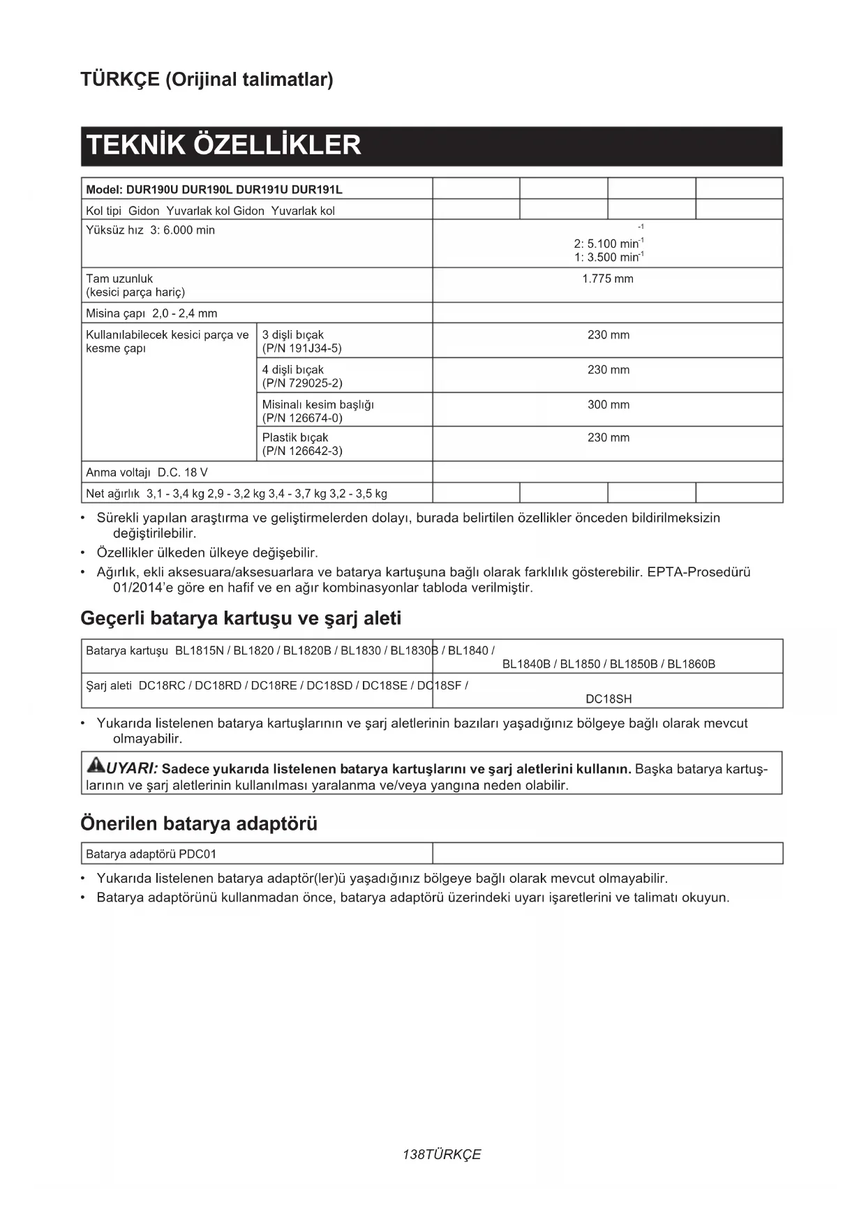 Misinaçapı 2,0 - 2,4 mm Kullanılabilecekkesiciparçave kesmeçapı 3dişlibıçak (P/N 191J34-5) 230 mm 4dişlibıçak (P/N 729025-2) 230 mm Misinalıkesimbaşlığı (P/N 126674-0) 300 mm Plastikbıçak (P/N 126642-3) 230 mm Anmavoltajı D.C. 18 V Netağırlık 3,1 - 3,4 kg 2,9 - 3,2 kg 3,4 - 3,7 kg 3,2 - 3,5 kg