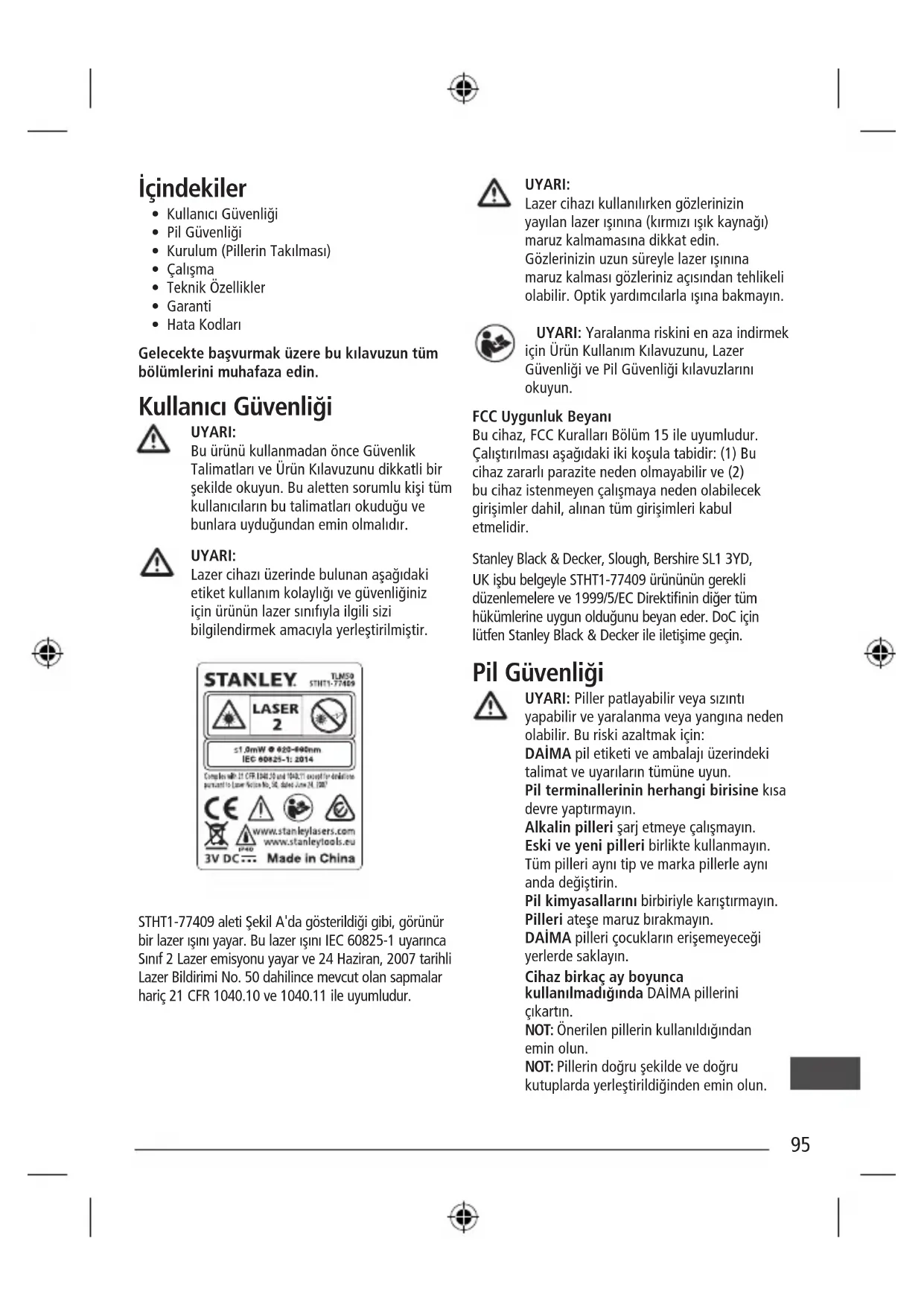 - Hata Kodları Gelecekte başvurmak üzere bu kılavuzun tüm bölümlerini muhafaza edin. Kullanıcı Güvenliği UYARI: Bu ürünü kullanmadan önce Güvenlik Talimatları ve Ürün Kılavuzunu dikkatli bir şekilde okuyun. Bu aletten sorumlu kişi tüm kullanıcıların bu talimatları okuduğu ve bunlara uyduğundan emin olmalıdır. UYARI: Lazer cihazı üzerinde bulunan aşağıdaki etiket kullanım kolaylığı ve güvenliğiniz için ürünün lazer sınıfıyla ilgili sizi bilgilendirmek amacıyla yerleştirilmiştir. STHT1-77409 aleti Şekil A'da gösterildiği gibi, görünür bir lazer ışını yayar. Bu lazer ışını IEC 60825-1 uyarınca Sınıf 2 Lazer emisyonu yayar ve 24 Haziran, 2007 tarihli Lazer Bildirimi No. 50 dahilince mevcut olan sapmalar hariç 21 CFR 1040.10 ve 1040.11 ile uyumludur. UYARI: Lazer cihazı kullanılırken gözlerinizin yayılan lazer ışınına (kırmızı ışık kaynağı) maruz kalmamasına dikkat edin. Gözlerinizin uzun süreyle lazer ışınına maruz kalması gözleriniz açısından tehlikeli olabilir. Optik yardımcılarla ışına bakmayın. UYARI: Yaralanma riskini en aza indirmek için Ürün Kullanım Kılavuzunu, Lazer Güvenliği ve Pil Güvenliği kılavuzlarını okuyun. FCC Uygunluk Beyanı Bu cihaz, FCC Kuralları Bölüm 15 ile uyumludur. Çalıştırılması aşağıdaki iki koşula tabidir: (1) Bu cihaz zararlı parazite neden olmayabilir ve (2) bu cihaz istenmeyen çalışmaya neden olabilecek girişimler dahil, alınan tüm girişimleri kabul etmelidir. Stanley Black & Decker, Slough, Bershire SL1 3YD, UK işbu belgeyle STHT1-77409 ürününün gerekli düzenlemelere ve 1999/5/EC Direktinin diğer tüm hükümlerine uygun olduğunu beyan eder. DoC için lütfen Stanley Black & Decker ile iletişime geçin. Pil Güvenliği UYARI: Piller patlayabilir veya sızıntı yapabilir ve yaralanma veya yangına neden olabilir. Bu riski azaltmak için: DAİMA pil etiketi ve ambalajı üzerindeki talimat ve uyarıların tümüne uyun. Pil terminallerinin herhangi birisine kısa devre yaptırmayın. Alkalin pilleri şarj etmeye çalışmayın. Eski ve yeni pilleri birlikte kullanmayın. Tüm pilleri aynı tip ve marka pillerle aynı anda değiştirin. Pil kimyasallarını birbiriyle karıştırmayın. Pilleri ateşe maruz bırakmayın. DAİMA pilleri çocukların erişemeyeceği yerlerde saklayın. Cihaz birkaç ay boyunca kullanılmadığında DAİMA pillerini çıkartın. NOT: Önerilen pillerin kullanıldığından emin olun. NOT: Pillerin doğru şekilde ve doğru kutuplarda yerleştirildiğinden emin olun. 95Kurulum (Pillerin Takılması)