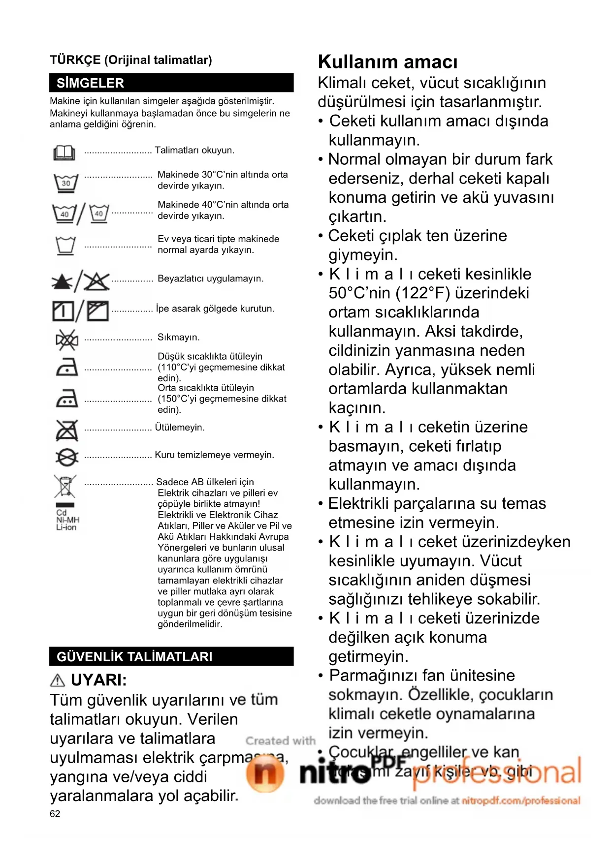 ΠΡΟΑΙΡΕΤΙΚΑ ΑΞΕΣΟΥΑΡ62 TÜRKÇE (Orijinal talimatlar) Makine için kullanılan simgeler aşağıda gösterilmiştir. Makineyi kullanmaya başlamadan önce bu simgelerin ne anlama geldiğini öğrenin. UYARI: Tüm güvenlik uyarılarını ve tüm talimatları okuyun. Verilen uyarılara ve talimatlara uyulmaması elektrik çarpmasına, yangına ve/veya ciddi yaralanmalara yol açabilir. Kullanım amacı Klimalı ceket, vücut sıcaklığının düşürülmesi için tasarlanmıştır.