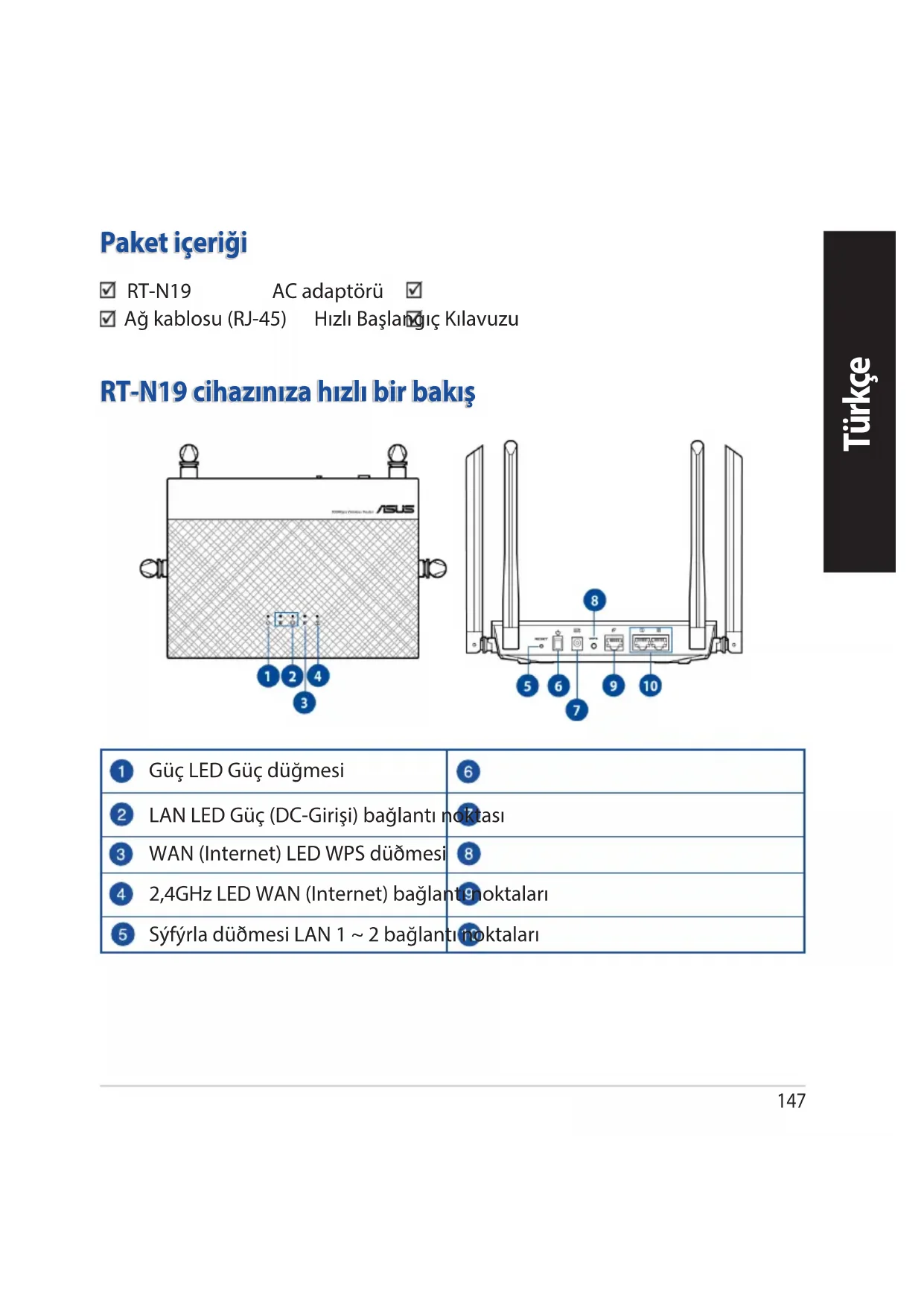 RT-N19 cihazınıza hızlı bir bakış Paket içeriği RT-N19 AC adaptörü Ağ kablosu (RJ-45) Hızlı Başlangıç Kılavuzu Güç LED Güç düğmesi LAN LED Güç (DC-Girişi) bağlantı noktası WAN (Internet) LED WPS düðmesi 2,4GHz LED WAN (Internet) bağlantı noktaları Sýfýrla düðmesi LAN 1 ~ 2 bağlantı noktaları TürkçeTürkçe