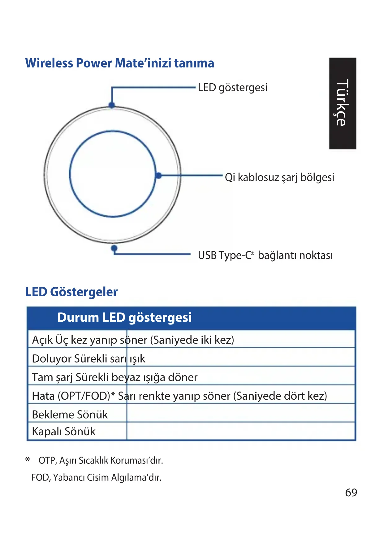 OTP, Aşırı Sıcaklık Koruması’dır. FOD, Yabancı Cisim Algılama’dır. Türkçe70 Kablosuz Şarj Standardı Qi 1.2.4 Şarj etme sıcaklığı