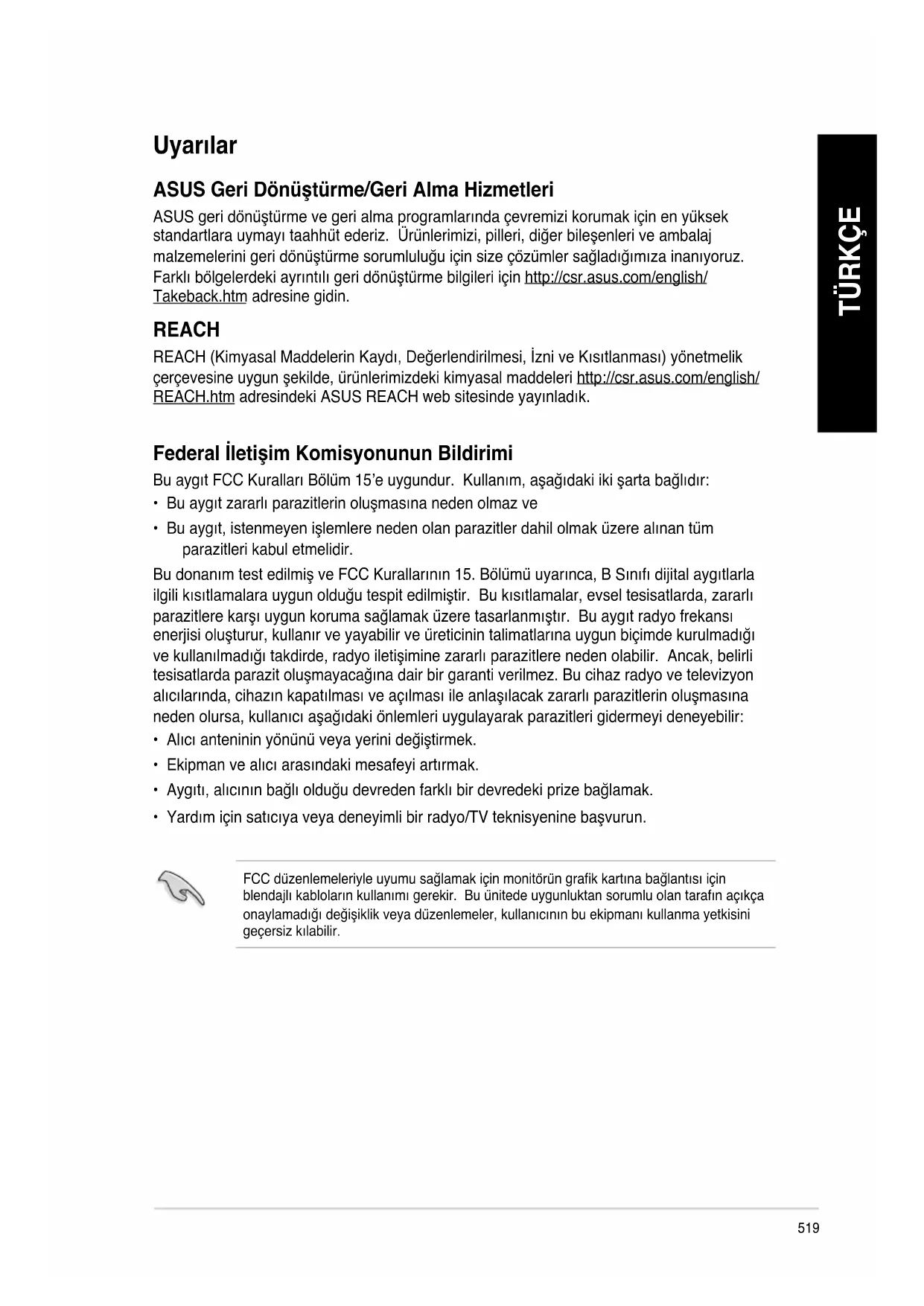 Uyarılar ASUS Geri Dönüştürme/Geri Alma Hizmetleri ASUS geri dönüştürme ve geri alma programlarında çevremizi korumak için en yüksek standartlara uymayı taahhüt ederiz. Ürünlerimizi, pilleri, diğer bileşenleri ve ambalaj malzemelerini geri dönüştürme sorumluluğu için size çözümler sağladığımıza inanıyoruz. Farklı bölgelerdeki ayrıntılı geri dönüştürme bilgileri için http://csr.asus.com/english/ Takeback.htm adresine gidin. REACH REACH (Kimyasal Maddelerin Kaydı, Değerlendirilmesi, İzni ve Kısıtlanması) yönetmelik çerçevesine uygun şekilde, ürünlerimizdeki kimyasal maddeleri http://csr.asus.com/english/ REACH.htm adresindeki ASUS REACH web sitesinde yayınladık. Federal İletişim Komisyonunun Bildirimi Bu aygıt FCC Kuralları Bölüm 15’e uygundur. Kullanım, aşağıdaki iki şarta bağlıdır: