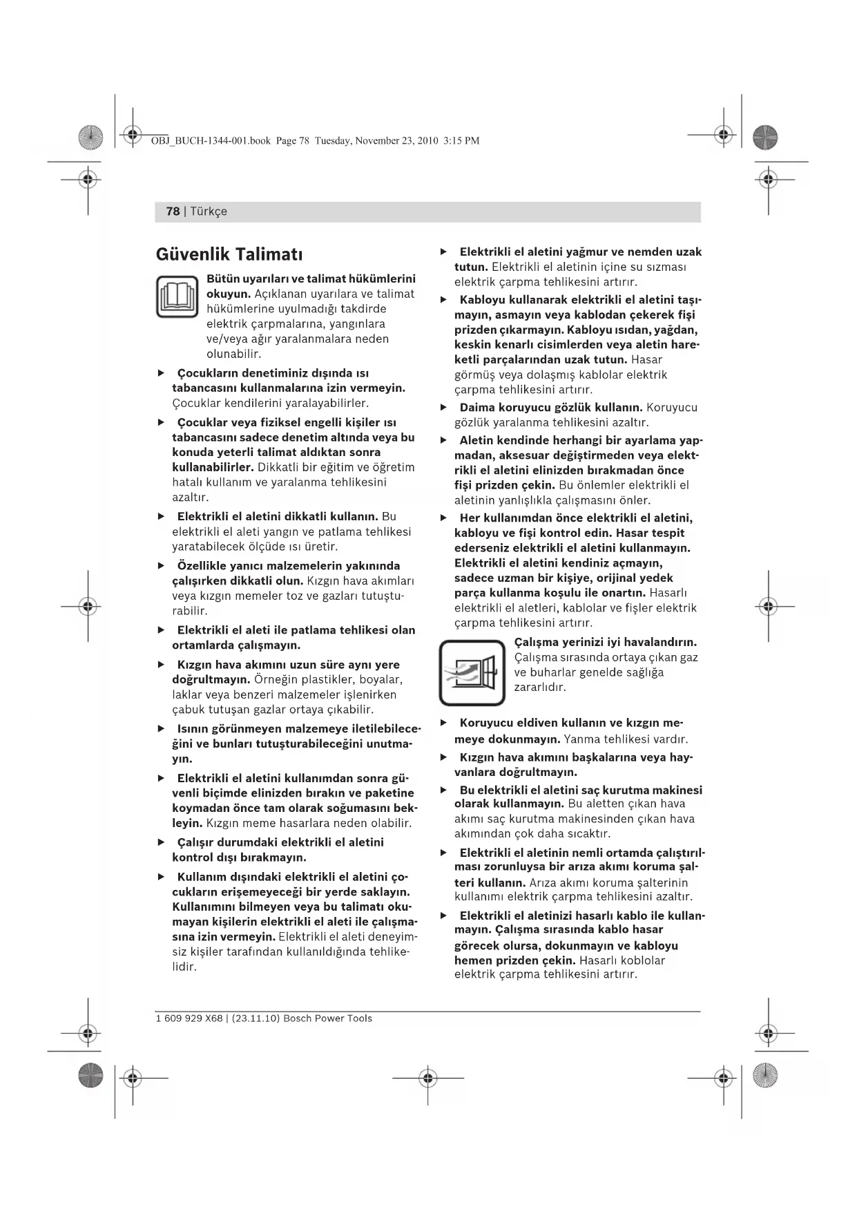 Güvenlik Talimat Bütün uyarlar ve talimat hükümlerini okuyun. Açklanan uyarlara ve talimat hükümlerine uyulmadğ takdirde elektrik çarpmalarna, yangnlara ve/veya ağr yaralanmalara neden olunabilir. f Çocuklarn denetiminiz dşnda s tabancasn kullanmalarna izin vermeyin. Çocuklar kendilerini yaralayabilirler. f Çocuklar veya fiziksel engelli kişiler s tabancasn sadece denetim altnda veya bu konuda yeterli talimat aldktan sonra kullanabilirler. Dikkatli bir eğitim ve öğretim hatal kullanm ve yaralanma tehlikesini azaltr. f Elektrikli el aletini dikkatli kullann. Bu elektrikli el aleti yangn ve patlama tehlikesi yaratabilecek ölçüde s üretir. f Özellikle yanc malzemelerin yaknnda çalşrken dikkatli olun. Kzgn hava akmlar veya kzgn memeler toz ve gazlar tutuştu- rabilir. f Elektrikli el aleti ile patlama tehlikesi olan ortamlarda çalşmayn. f Kzgn hava akmn uzun süre ayn yere doğrultmayn. Örneğin plastikler, boyalar, laklar veya benzeri malzemeler işlenirken çabuk tutuşan gazlar ortaya çkabilir. f Isnn görünmeyen malzemeye iletilebilece- ğini ve bunlar tutuşturabileceğini unutma- yn. f Elektrikli el aletini kullanmdan sonra gü- venli biçimde elinizden brakn ve paketine koymadan önce tam olarak soğumasn bek- leyin. Kzgn meme hasarlara neden olabilir. f Çalşr durumdaki elektrikli el aletini kontrol dş brakmayn. f Kullanm dşndaki elektrikli el aletini ço- cuklarn erişemeyeceği bir yerde saklayn. Kullanmn bilmeyen veya bu talimat oku- mayan kişilerin elektrikli el aleti ile çalşma- sna izin vermeyin. Elektrikli el aleti deneyim- siz kişiler tarafndan kullanldğnda tehlike- lidir. f Elektrikli el aletini yağmur ve nemden uzak tutun. Elektrikli el aletinin içine su szmas elektrik çarpma tehlikesini artrr. f Kabloyu kullanarak elektrikli el aletini taş- mayn, asmayn veya kablodan çekerek fişi prizden çkarmayn. Kabloyu sdan, yağdan, keskin kenarl cisimlerden veya aletin hare- ketli parçalarndan uzak tutun. Hasar görmüş veya dolaşmş kablolar elektrik çarpma tehlikesini artrr. f Daima koruyucu gözlük kullann. Koruyucu gözlük yaralanma tehlikesini azaltr. f Aletin kendinde herhangi bir ayarlama yap- madan, aksesuar değiştirmeden veya elekt- rikli el aletini elinizden brakmadan önce fişi prizden çekin. Bu önlemler elektrikli el aletinin yanlşlkla çalşmasn önler. f Her kullanmdan önce elektrikli el aletini, kabloyu ve fişi kontrol edin. Hasar tespit ederseniz elektrikli el aletini kullanmayn. Elektrikli el aletini kendiniz açmayn, sadece uzman bir kişiye, orijinal yedek parça kullanma koşulu ile onartn. Hasarl elektrikli el aletleri, kablolar ve fişler elektrik çarpma tehlikesini artrr. Çalşma yerinizi iyi havalandrn. Çalşma srasnda ortaya çkan gaz ve buharlar genelde sağlğa zararldr. f Koruyucu eldiven kullann ve kzgn me- meye dokunmayn. Yanma tehlikesi vardr. f Kzgn hava akmn başkalarna veya hay- vanlara doğrultmayn. f Bu elektrikli el aletini saç kurutma makinesi olarak kullanmayn. Bu aletten çkan hava akm saç kurutma makinesinden çkan hava akmndan çok daha scaktr. f Elektrikli el aletinin nemli ortamda çalştrl- mas zorunluysa bir arza akm koruma şal- teri kullann. Arza akm koruma şalterinin kullanm elektrik çarpma tehlikesini azaltr. f Elektrikli el aletinizi hasarl kablo ile kullan- mayn. Çalşma srasnda kablo hasar görecek olursa, dokunmayn ve kabloyu hemen prizden çekin. Hasarl koblolar elektrik çarpma tehlikesini artrr. OBJ_BUCH-1344-001.book Page 78 Tuesday, November 23, 2010 3:15 PMTürkçe | 79 Bosch Power Tools 1 609 929 X68 | (23.11.10) Fonksiyon tanm Lütfen aletin resminin göründüğü sayfay açn ve bu kullanm klavuzunu okuduğunuz sürece bu sayfay açk tutun. Usulüne uygun kullanm Bu elektrikli el aleti; plastiklerin biçimlerdiril- mesi ve kaynaklanmas, eski boyalarn kaznmas ve kör hortumlarn stlmas için geliştirilmiştir. Bu alet ayn zamanda lenim ve kalaylama, yapş- kan bağlantlarn çözülmesi ve su borularnn stlmasna da uygundur. Şekli gösterilen elemanlar Şekli gösterilen elemanlarn numaralar grafik sayfasndaki elektrikli el aleti resmindeki numaralarla ayndr. 1 Meme 2 Isdan koruma parças 3 Brakma yüzeyi 4 Hava miktar ve scaklk regülatörlü açma/ kapama şalteri (GHG 500-2/GHG 600-3) 5 Debi ayarl açma/kapama şalteri (GHG 630 DCE) 6 Scaklk regülasyon düğmesi (GHG 630 DCE) 7 Display (GHG 630 DCE) 8 Yüzey memesi* 9 Cam koruyucu meme* 10 Reflektör meme* 11 Kaynak teli* 12 Kaynak pabucu* 13 Redüksiyon memesi* 14 Kör hortum* 15 Köşeli meme* *Şekli gösterilen veya tanmlanan aksesuar standart teslimat kapsamnda değildir. Aksesuarn tümünü aksesuar programmzda bulabilirsiniz. Gürültü emisyonu hakknda bilgi Gürültüye ait ölçme değerleri EN 60745’e göre tespit edilmektedir. Elektrikli el aletinin A-değerlendirmeli ses basnc seviyesi tipik olarak 70 dB(A)’dan düşüktür. Teknik veriler Is tabancas GHG ... Professional