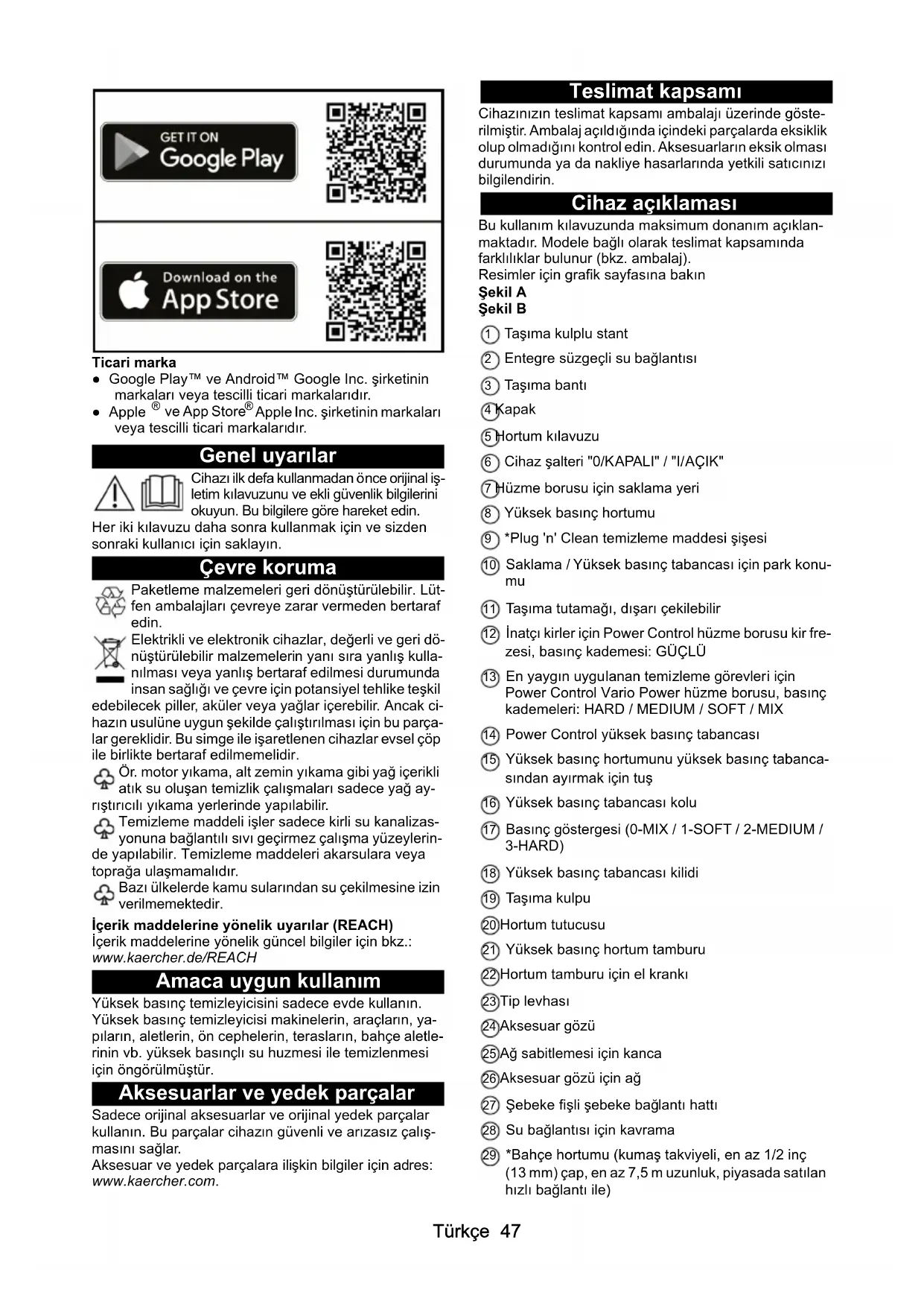 Apple Inc. şirketinin markaları veya tescilli ticari markalarıdır. Genel uyarılar Cihazı ilk defa kullanmadan önce orijinal iş- letim kılavuzunu ve ekli güvenlik bilgilerini okuyun. Bu bilgilere göre hareket edin. Her iki kılavuzu daha sonra kullanmak için ve sizden sonraki kullanıcı için saklayın. Çevre koruma Paketleme malzemeleri geri dönüştürülebilir. Lüt- fen ambalajları çevreye zarar vermeden bertaraf edin. Elektrikli ve elektronik cihazlar, değerli ve geri dö- nüştürülebilir malzemelerin yanı sıra yanlış kulla- nılması veya yanlış bertaraf edilmesi durumunda insan sağlığı ve çevre için potansiyel tehlike teşkil edebilecek piller, aküler veya yağlar içerebilir. Ancak ci- hazın usulüne uygun şekilde çalıştırılması için bu parça- lar gereklidir. Bu simge ile işaretlenen cihazlar evsel çöp ile birlikte bertaraf edilmemelidir. Ör. motor yıkama, alt zemin yıkama gibi yağ içerikli atık su oluşan temizlik çalışmaları sadece yağ ay- rıştırıcılı yıkama yerlerinde yapılabilir. Temizleme maddeli işler sadece kirli su kanalizas- yonuna bağlantılı sıvı geçirmez çalışma yüzeylerin- de ya pılabilir. Temizleme maddeleri akarsulara veya toprağa ulaşmamalıdır. Bazı ülkelerde kamu sularından su çekilmesine izin verilmemektedir. İçerik maddelerine yönelik uyarılar (REACH) İçerik maddelerine yönelik güncel bilgiler için bkz.: www.kaercher.de/REACH Amaca uygun kullanım Yüksek basınç temizleyicisini sadece evde kullanın. Yüksek basınç temizleyicisi makinelerin, araçların, ya- pıların, aletlerin, ön cephelerin, terasların, bahçe aletle- rinin vb. yüksek basınçlı su huzmesi ile temizlenmesi için öngörülmüştür. Aksesuarlar ve yedek parçalar Sadece orijinal aksesuarlar ve orijinal yedek parçalar kullanın. Bu parçalar cihazın güvenli ve arızasız çalış- masını sağlar. Aksesuar ve yedek parçalara ilişkin bilgiler için adres: www.kaercher.com. Teslimat kapsamı Cihazınızın teslimat kapsamı ambalajı üzerinde göste- rilmiştir. Ambalaj açı ldığında içindeki parçalarda eksiklik olup olmadığını kontrol edin. Aksesuarların eksik olması durumunda ya da nakliye hasarlarında yetkili satıcınızı bilgilendirin. Cihaz açıklaması Bu kullanım kılavuzunda maksimum donanım açıklan- maktadır. Modele bağlı olarak teslimat kapsamında farklılıklar bulunur (bkz. ambalaj). Resimler için grafik sayfasına bakın Şekil A Şekil B 1 Taşıma kulplu stant 2 Entegre süzgeçli su bağlantısı 3 Taşıma bantı 4 Kapak 5 Hortum kılavuzu 6 Cihaz şalteri "0/KAPALI" / "I/AÇIK" 7 Hüzme borusu için saklama yeri 8 Yüksek basınç hortumu 9 *Plug 'n' Clean temizleme maddesi şişesi 10 Saklama / Yüksek basınç tabancası için park konu-