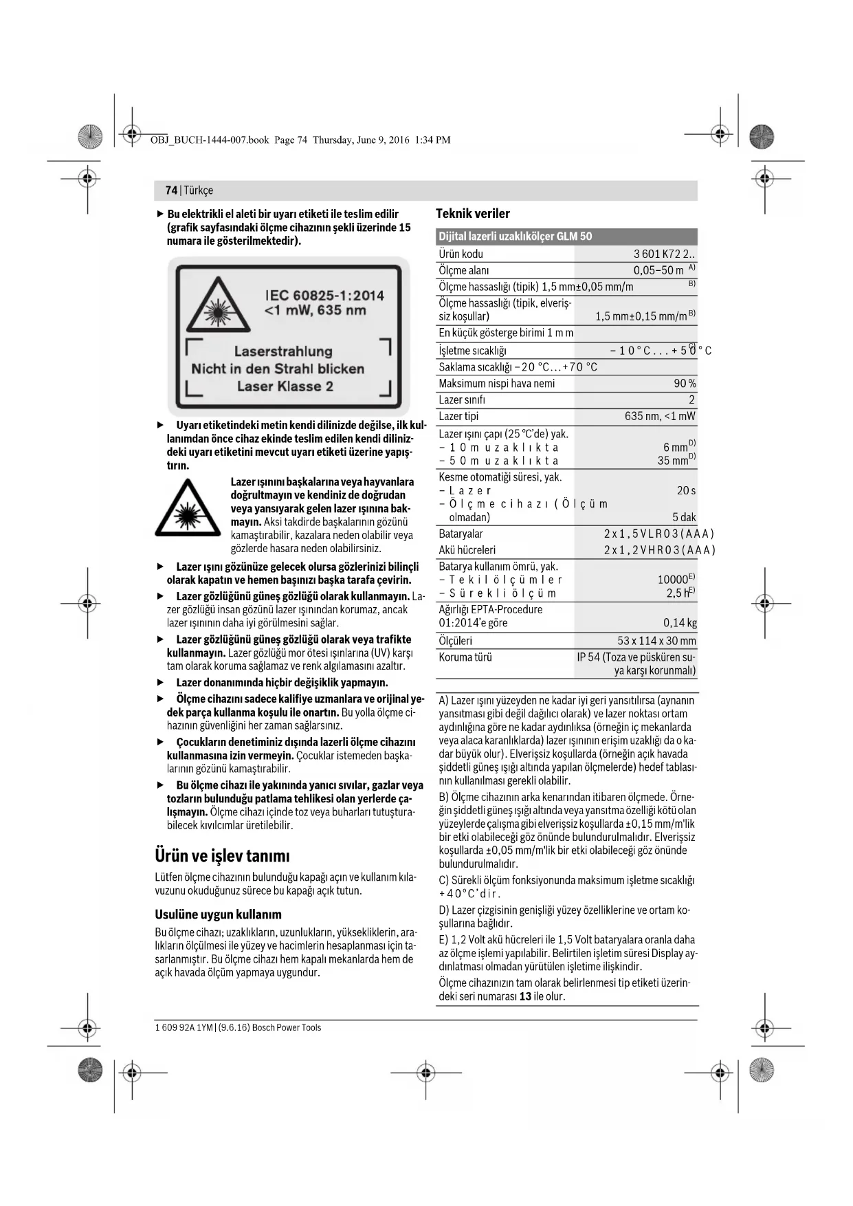 Ağırlığı EPTA-Procedure 01:2014’e göre 0,14 kg Ölçüleri 53 x 114 x 30 mm Koruma türü IP 54 (Toza ve püsküren su- ya karşı korunmalı) A) Lazer ışını yüzeyden ne kadar iyi geri yansıtılırsa (aynanın yansıtması gibi değil dağılıcı olarak) ve lazer noktası ortam aydınlığına göre ne kadar aydınlıksa (örneğin iç mekanlarda veya alaca karanlıklarda) lazer ışınının erişim uzaklığı da o ka- dar büyük olur). Elverişsiz koşullarda (örneğin açık havada şiddetli güneş ışığı altında yapılan ölçmelerde) hedef tablası- nın kullanılması gerekli olabilir. B) Ölçme cihazının arka kenarından itibaren ölçmede. Örne- ğin şiddetli güneş ışığı altında veya yansıtma özelliği kötü olan yüzeylerde çalışma gibi elverişsiz koşullarda ±0,15 mm/m'lik bir etki olabileceği göz önünde bulundurulmalıdır. Elverişsiz koşullarda ±0,05 mm/m'lik bir etki olabileceği göz önünde bulundurulmalıdır. C) Sürekli ölçüm fonksiyonunda maksimum işletme sıcaklığı +40°C’dir. D) Lazer çizgisinin genişliği yüzey özelliklerine ve ortam ko- şullarına bağlıdır. E) 1,2 Volt akü hücreleri ile 1,5 Volt bataryalara oranla daha az ölçme işlemi yapılabilir. Belirtilen işletim süresi Display ay- dınlatması olmadan yürütülen işletime ilişkindir. Ölçme cihazınızın tam olarak belirlenmesi tip etiketi üzerin- deki seri numarası 13 ile olur. OBJ_BUCH-1444-007.book Page 74 Thursday, June 9, 2016 1:34 PMTürkçe | 75 Bosch Power Tools 1 609 92A 1YM | (9.6.16) Şekli gösterilen elemanlar Şekli gösterilen cihaz elemanlarının numaraları ölçme cihazı- nın şeklinin bulunduğu grafik sayfasında bulunmaktadır. 1 Display 2 Ölçme tuşu 3 Yüzey, hacim ve endirekt yükseklik ölçümü (Pisagor) tuşu 4 Silme tuşu / Açma/kapama tuşu ** 5 Eksi tuşu 6 Referans düzlem seçme tuşu 7 Taşıma halkası yuvası 8 İmpuls tuşu 9 Uzunluk ve sürekli ölçüm tuşu 10 Batarya gözü kapağı 11 Lazer ışını çıkma yeri 12 Algılama merceği 13 Seri numarası 14 1/4"-Diş 15 Lazer uyarı etiketi 16 Batarya gözü kapak kilidi 17 Koruyucu çanta 18 Sehpa* 19 Lazer gözlüğü* 20 Lazer hedef tablası*