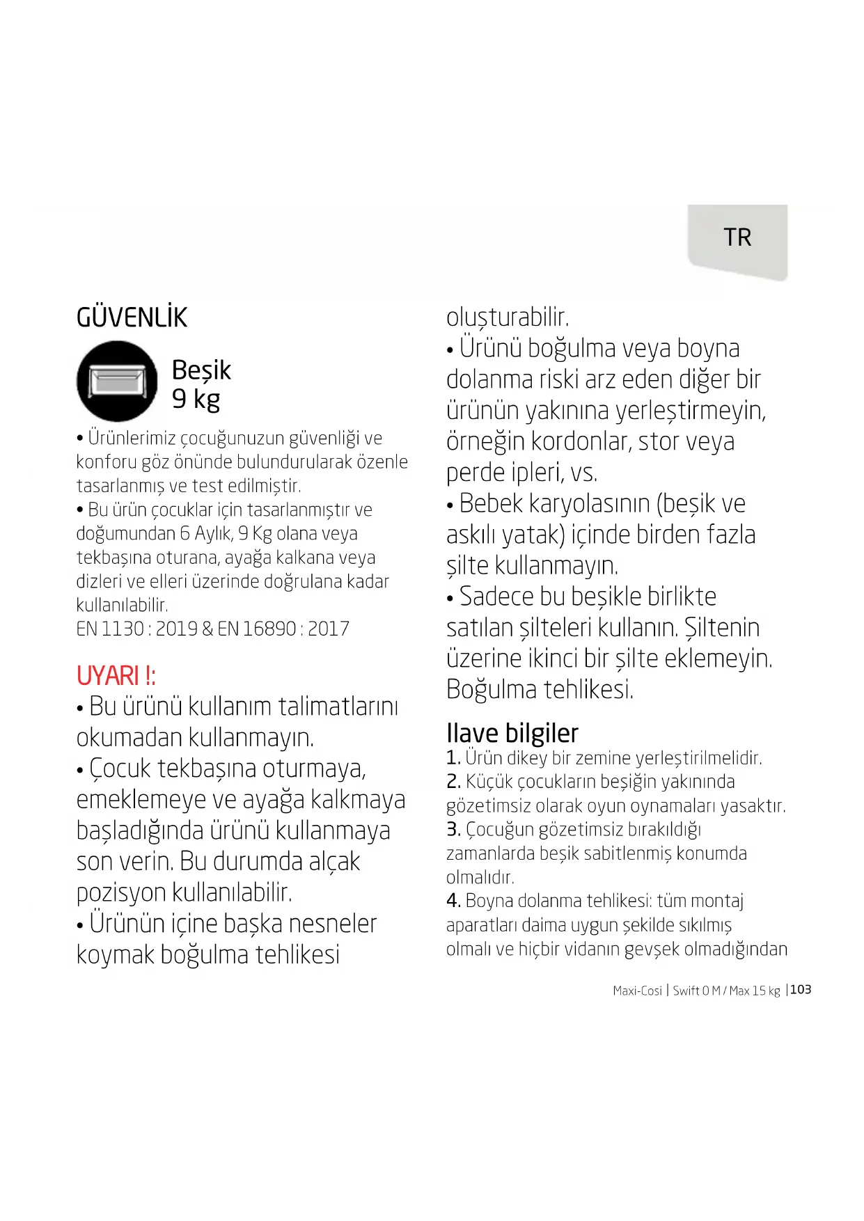 - Bu ürün 15 kg’ya kadar olan çocuklar için tasarlanmıştır (bu ortalama 0 - 42 aylık arasıdır). EN 716-1 : 2017 & EN 16890 : 2017 UYARI!: